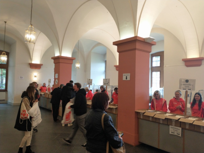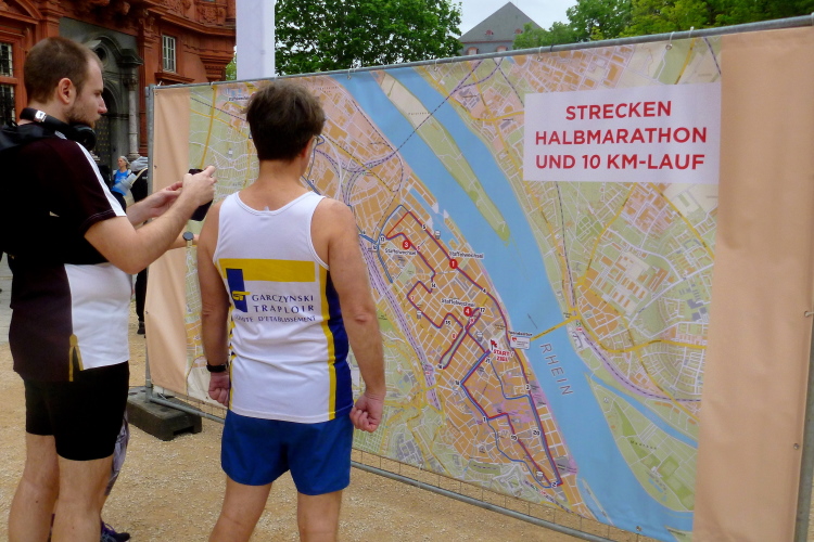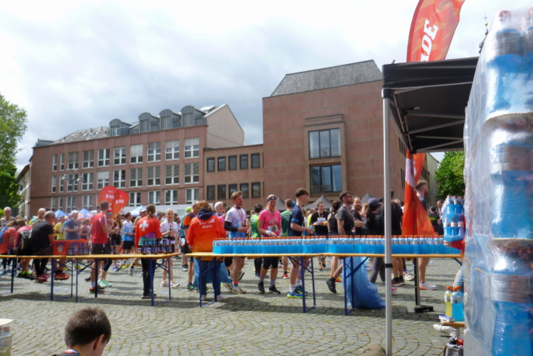 Auf der linksrheinischen Seite sehe ich dann schon das Kurfürstliche Schloss, im Gewölbesaal findet die Expo- und Verkaufsmesse statt. Zudem werden die Startunterlagen ausgegeben. Neben der Startnummer (Chip auf der Rückseite) erhalten wir ein Getränk, ein wenig Infomaterial und ein ergiebiges Programmheft. Die Unterlagen werden schon Freitagnachmittag abgegeben und nachmelden kann man sogar noch bis zum Samstag auf der Expo. Für 10 Euro habe ich mir ein Verpflegungspaket aus zwei Getränken und einem Nudelgericht dazu gebucht. Die Startgebühr für den Halbmarathon beginnt für die ersten 1000 Meldungen bei 47 Euro und steigt auf bis zu 80 für Nachmelder an. Dafür erhalten wir die bei einem großen Lauf übliche Versorgung, einschließlich einem Massageservice. Ein Laufshirt kann für 20 Euro gekauft werden.