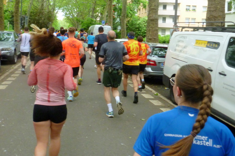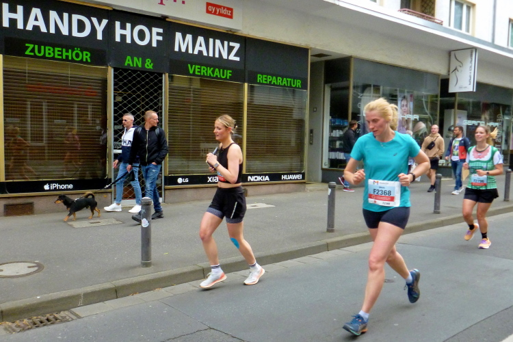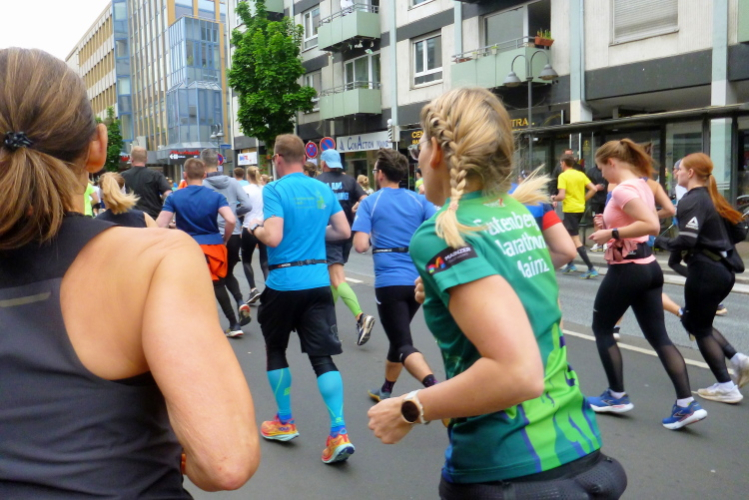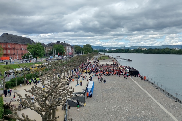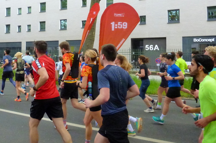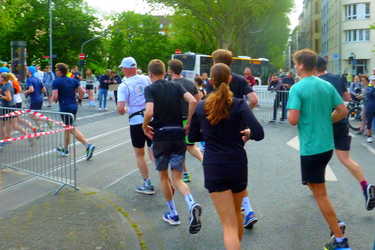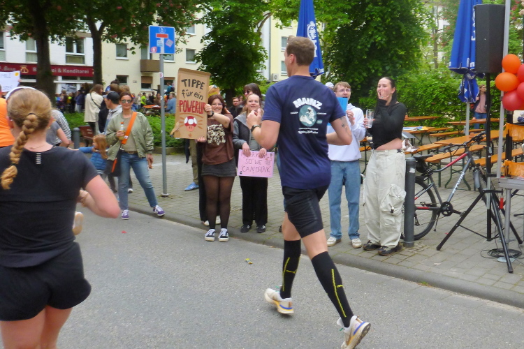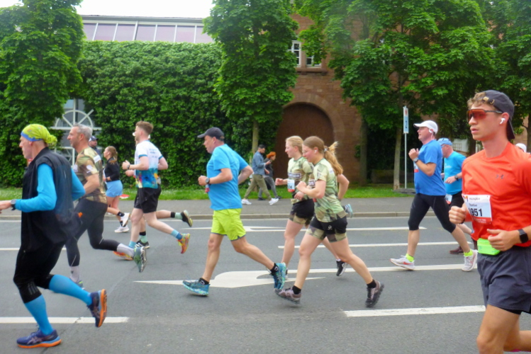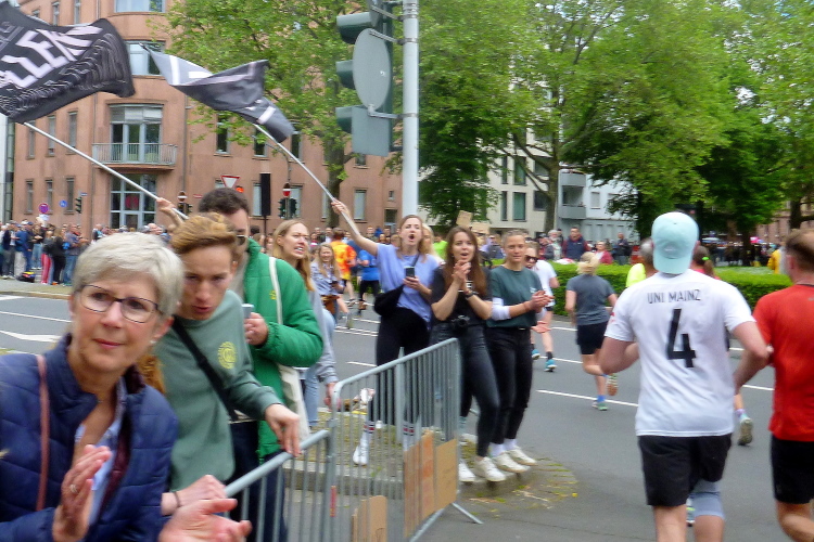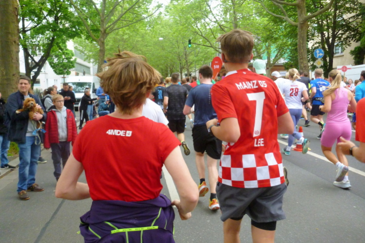 Wir laufen weiter auf der Rheinallee, die Mainzer Husarengarde macht mit Trommeln und Schellenbaum Stimmung. Man spürt, dass an solchen Hotspots gleich schneller gelaufen wird. Ratsam wäre, solche Tempowechsel zu vermeiden. Viele Läufer sehe ich in den auffällig roten Trikots von Mainz 05 gekleidet, die gegenwärtig in der Bundesliga mit dem Rücken zur Wand spielen.