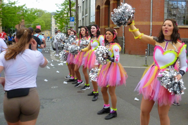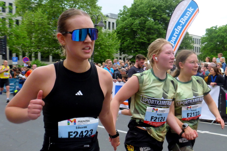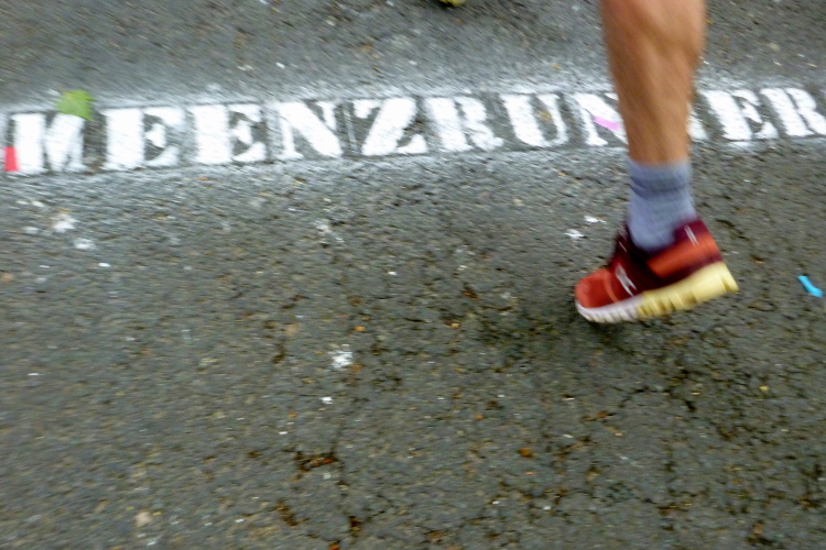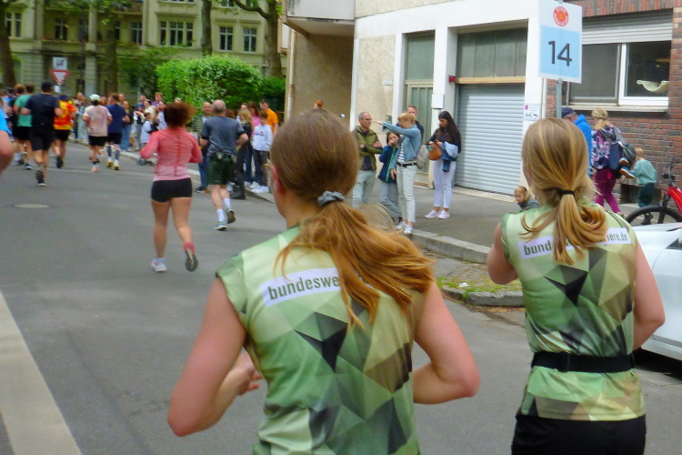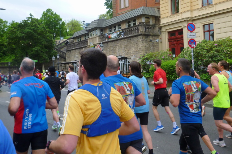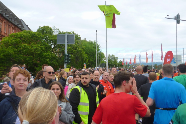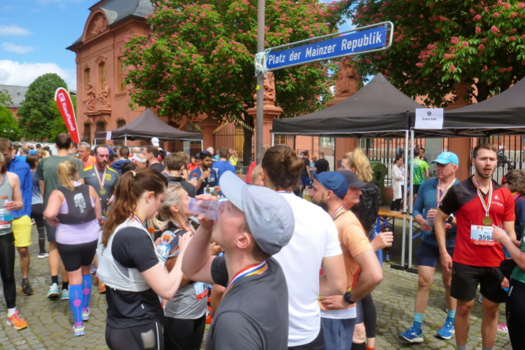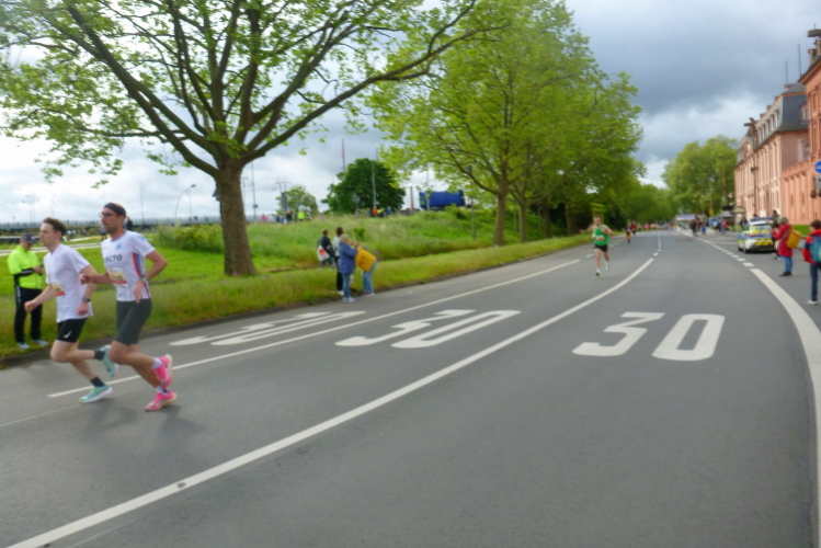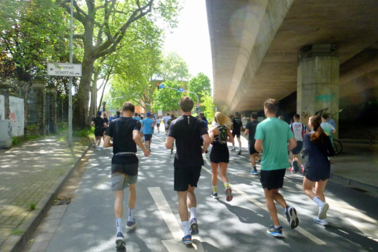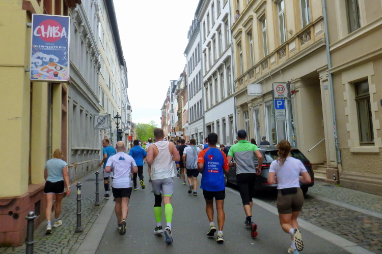 Wir laufen weiter auf der Rheinallee, die Mainzer Husarengarde macht mit Trommeln und Schellenbaum Stimmung. Man spürt, dass an solchen Hotspots gleich schneller gelaufen wird. Ratsam wäre, solche Tempowechsel zu vermeiden. Viele Läufer sehe ich in den auffällig roten Trikots von Mainz 05 gekleidet, die gegenwärtig in der Bundesliga mit dem Rücken zur Wand spielen.