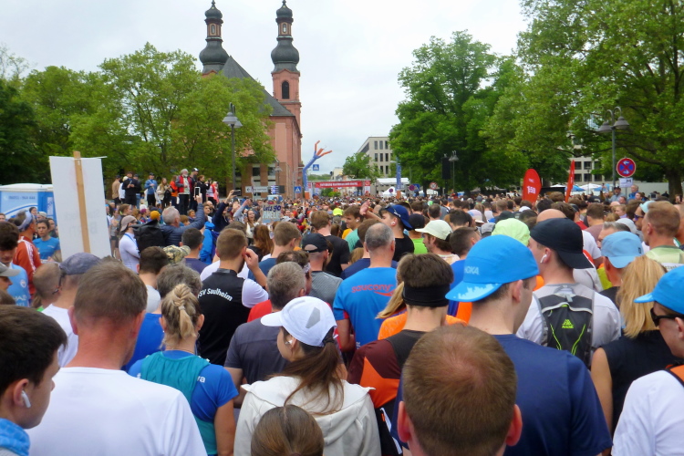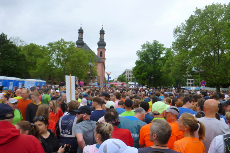 Umziehen kann man sich in der Tiefgarage des Deutschhausplatzes, gleich an Start und Zielgelände angrenzend. Also ein Halbmarathon der kurzen Wege. Unten ist genügend Platz und viele Helfer stehen hinter den Tischen und bereit, Gepäckstücke entgegenzunehmen. Da es im Freien noch bedeckt und leicht windig ist, halte ich mich noch eine Zeitlang im Untergrund auf. Dann treibt es mich doch 30 Minuten vor dem Start (10.00 Uhr) hinauf und hinaus.