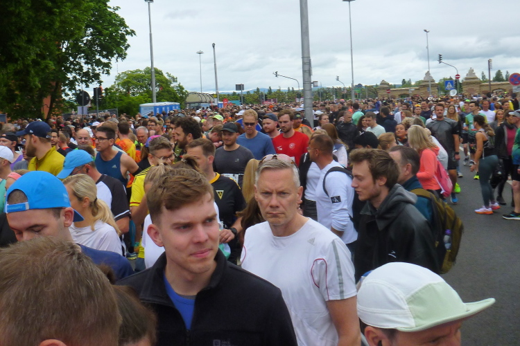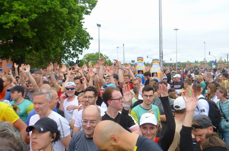 Dann nähert sich die Uhr der Startzeit, wir werden gepusht und heben die Arme und winken. Die letzten Läufer steigen über die Absperrungen, es ist sehr eng im Block. Wer unter Klaustrophobie leidet, wird den Wunsch äußern, aus der Situation zu fliehen. Im weitesten Sinne trifft das auch auf uns zu, denn nach dem Startschuss werden gut 6000 Läufer die Flucht nach vorne antreten. Mehr oder weniger schnell. Ich bin schon gespannt, wie die Siegerzeiten sein werden. Der Veranstalter ist diesbezüglich als ziemlich ambitioniert bekannt.