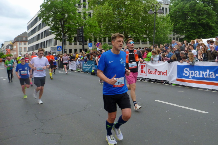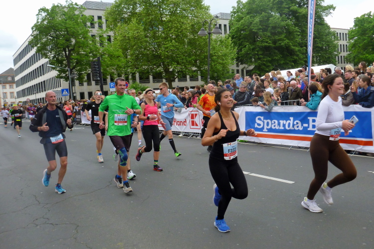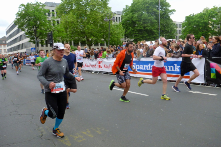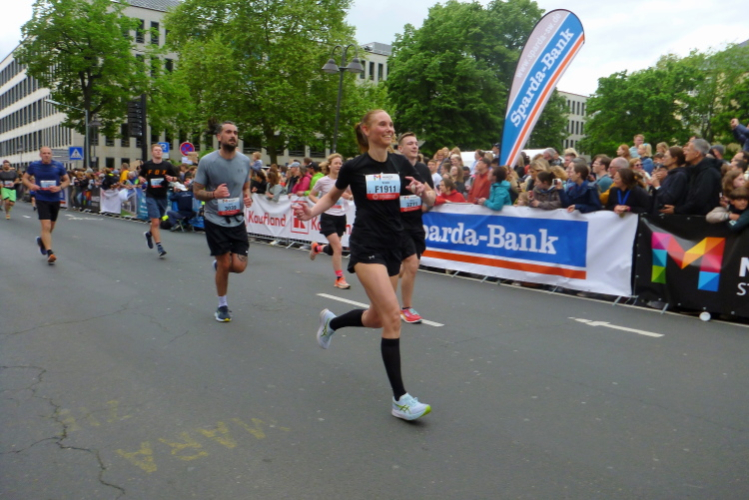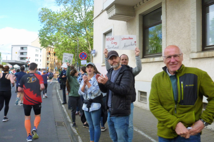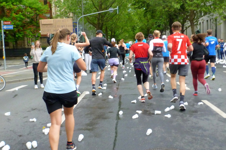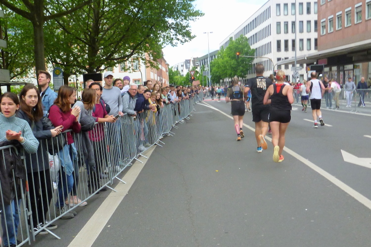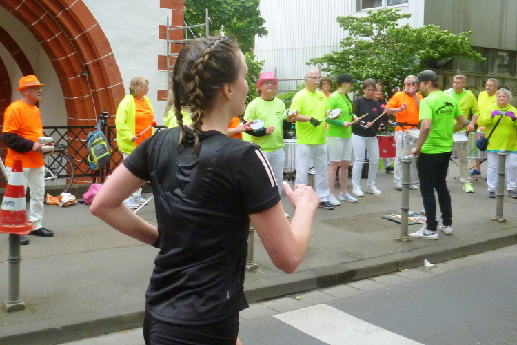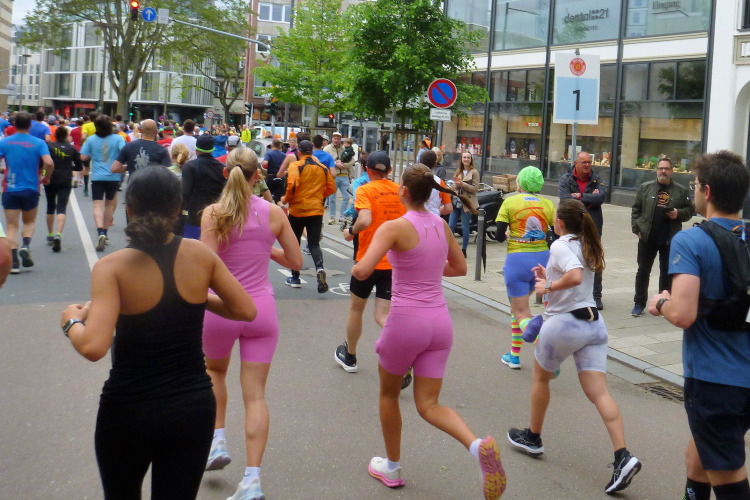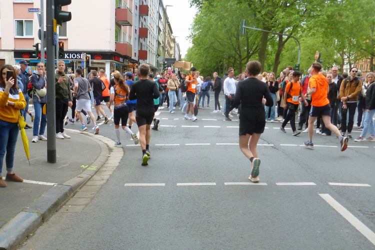 Über die Augustinerstraße erreichen wir die Rheinstraße mit Kilometer 20. Die Band Level Lot mit ihrer Guggemusik leitet den Endspurt ein. Viele Läufer haben noch Körner und ziehen an. Vor allem auch Läuferinnen, vor denen ich mich besonders verneige. „Läuft bei Dir“, lese ich auf einem Schild. Es geht in die Quintinstraße. Norbert, bester und fleißigster Fotograf in der Laufszene, hat mich entdeckt und ruft mir nach. Das hilft mir auf der letzten Steigung auf der Schusterstraße und Flachsmarktstraße. Am Ende biegen wir rechts in die Große Bleiche ein. Ich sehe das Zieltransparent 100 Meter vor mir.