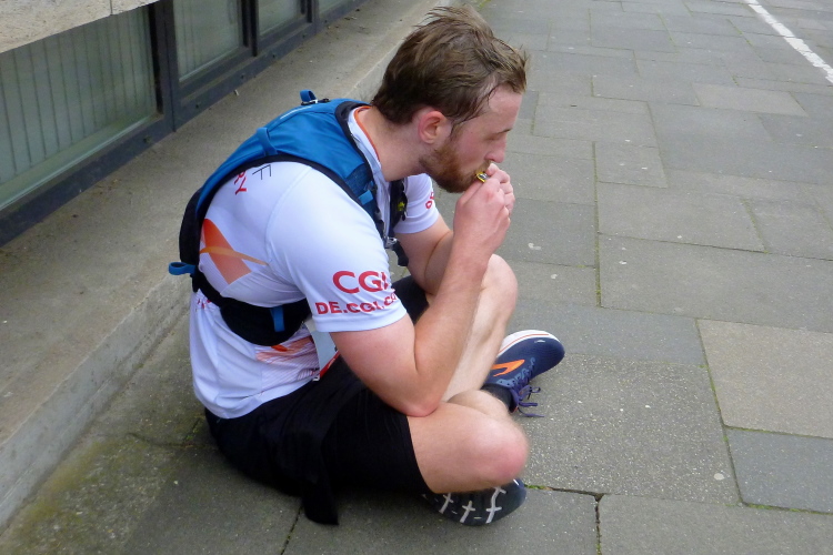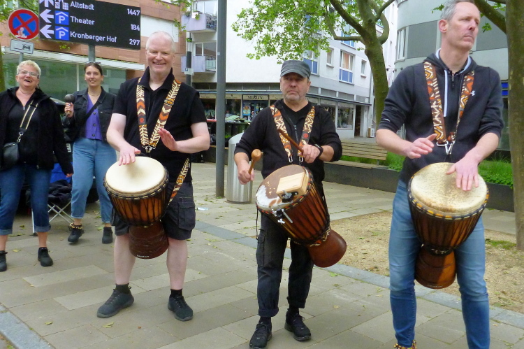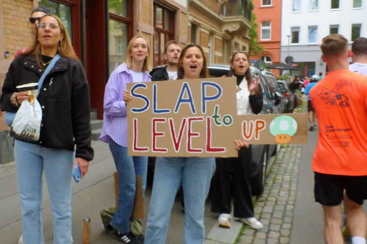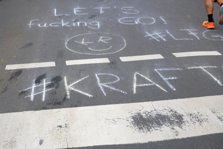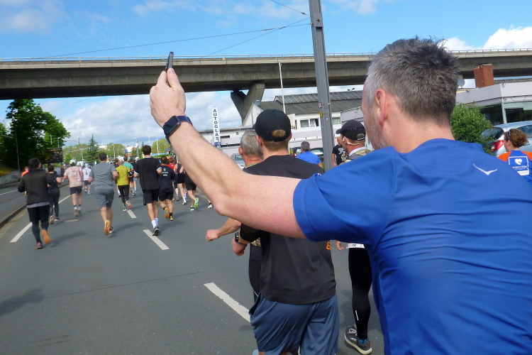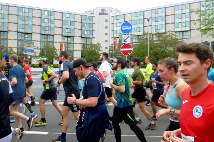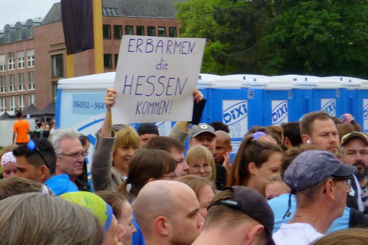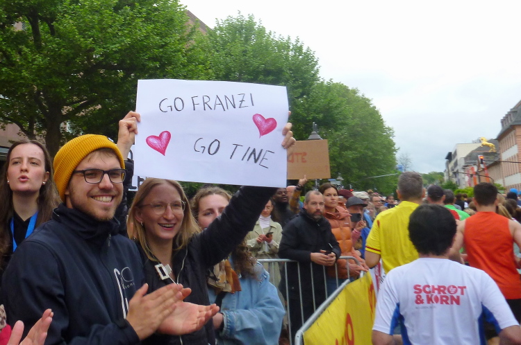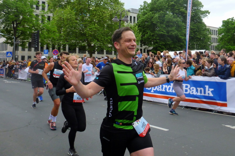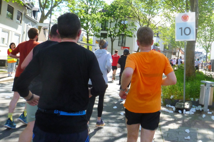Über die Augustinerstraße erreichen wir die Rheinstraße mit Kilometer 20. Die Band Level Lot mit ihrer Guggemusik leitet den Endspurt ein. Viele Läufer haben noch Körner und ziehen an. Vor allem auch Läuferinnen, vor denen ich mich besonders verneige. „Läuft bei Dir“, lese ich auf einem Schild. Es geht in die Quintinstraße. Norbert, bester und fleißigster Fotograf in der Laufszene, hat mich entdeckt und ruft mir nach. Das hilft mir auf der letzten Steigung auf der Schusterstraße und Flachsmarktstraße. Am Ende biegen wir rechts in die Große Bleiche ein. Ich sehe das Zieltransparent 100 Meter vor mir.