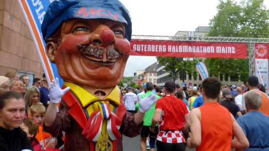 An der Kirchenglocke St. Peter schlägt’s nicht Dreizehn, sondern Zehn und gleichzeitig geht die Startpistole los. Doch es dauert fast zwei Minuten, bis ich die Zeitmatten überlaufe und damit die persönliche Zeitmessung ausgelöst wird. Einen Schwellkopp hat man davor positioniert, Markenzeichen der Mainzer Rosenmontagszüge. 30 dieser Figuren besitzt der Mainzer Carneval-Verein und ausgeliehen wurde für den heutigen Halbmarathon der Knollenas.
