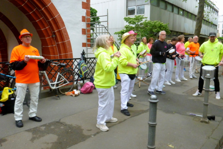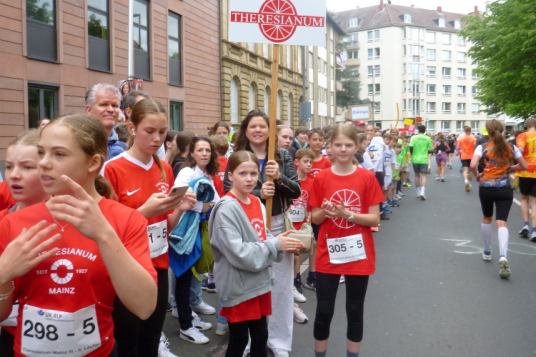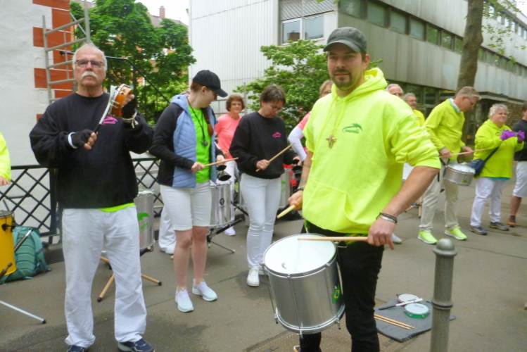 Bei Kilometer 2 biegen wir auf die Rhein-Straße ein, kurz zuvor sahen wir den Bahnhof Römisches Theater. Sambaklänge mit der Bateria Caipirinha lassen nicht nur mich schneller laufen. Dann kommt das Spendentor bei Kilometer 3, mit einem Durchlaufen spendet der Läufer einen geringen Betrag an die Stiftung Herzenssache. Zuvor rennen wir an der Rheingoldhalle vorbei, dort war viele Jahre das Headquarter vom Gutenbergmarathon.
