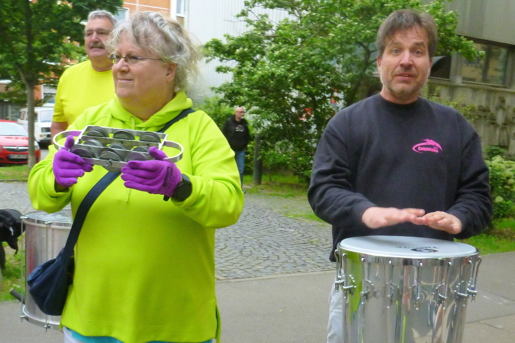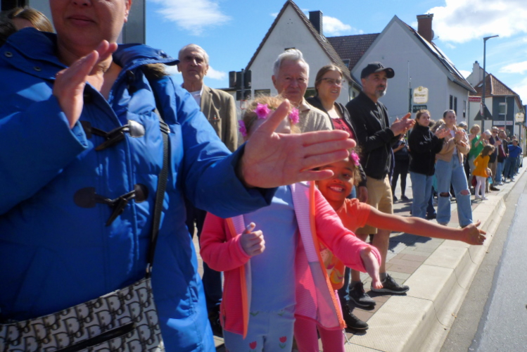 An einem Hauseck könnten wir nochmal an einer privaten Wasserstation Aqua fassen. Meine Nachfrage nach Bier wird negativ beschieden. Im Ziel gäbe es den Stoff. Die Musikgruppen kommen in immer kürzeren Abständen, so, als wolle man den Läufern auf den letzten zwei Kilometern noch einmal richtig Beine machen. Oder sie motivieren. Ein Mädel geht, ich ermuntere sie zum Weiterlaufen, sie trabt an, bleibt jedoch nach einigen Metern wieder stehen. Vernünftig, wenn’s einfach nicht mehr geht.