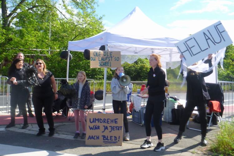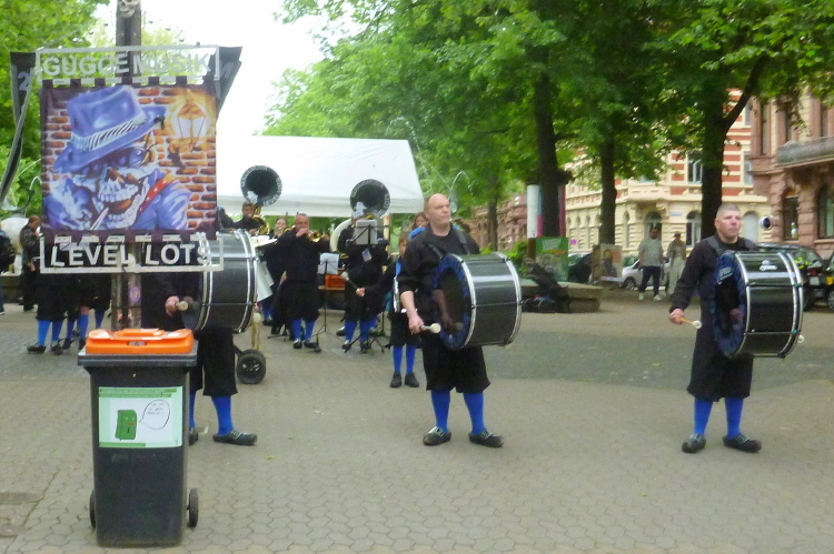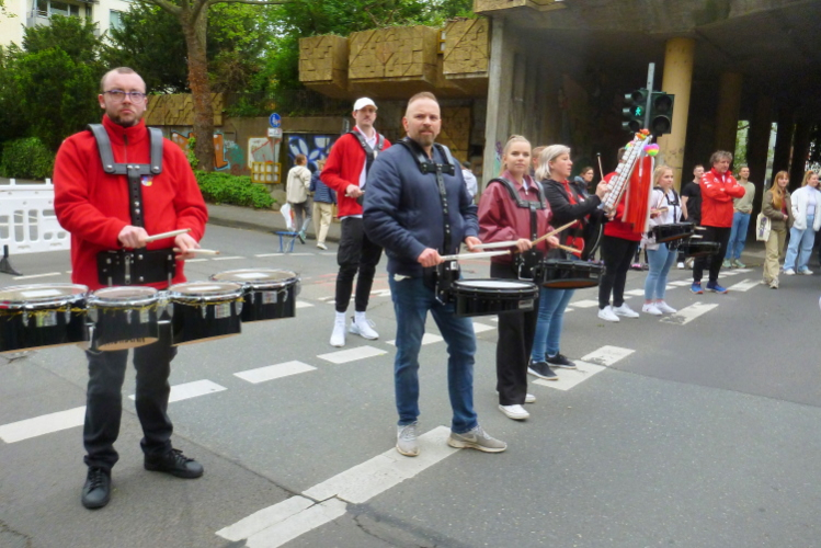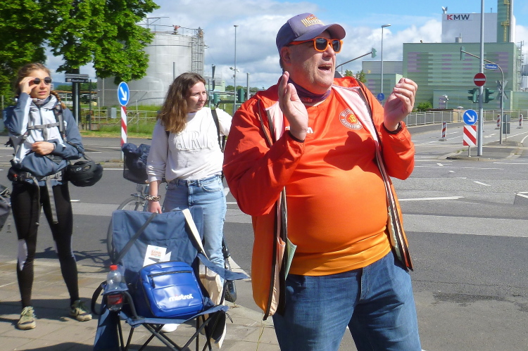 Wir unterqueren die Eisenbahnlinie nach Wiesbaden und ins Rheinhessische und erreichen mit Kilometer 7 den Stadtteil Mainz-Mombach. Dieser ist aufgrund der vielen Veranstaltungen als Fastnachtshochburg bekannt. Einer der ältesten Vereine ist der Mombacher Carneval Verein „Die Bohnebeitel“, deren Fasnachtssitzung regelmäßig im SWR übertragen wird. Passend dazu unterhält uns mit schrägen Tönen eine Guggemusik.