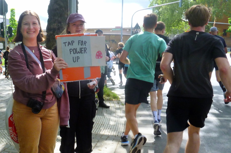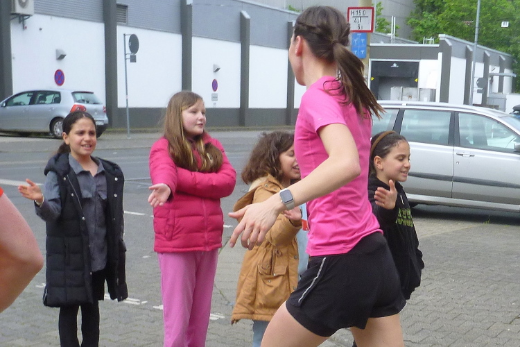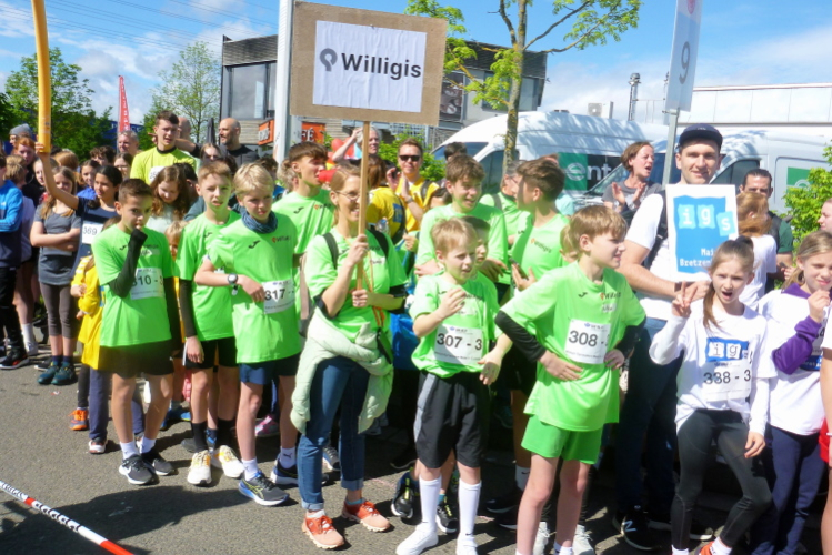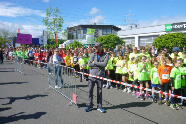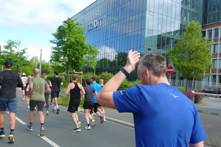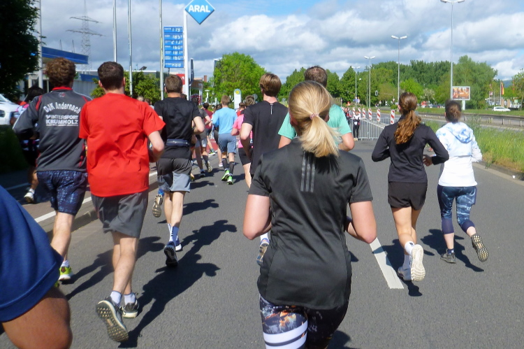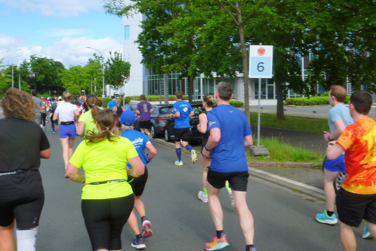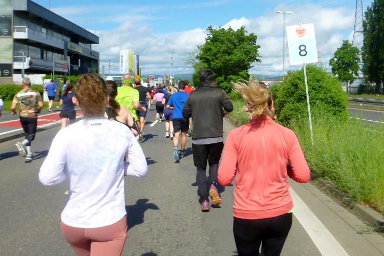 Etwa einen Kilometer lang laufen wir parallel zu einem Autobahnzubringer durch ein Industriegebiet, kurzzeitig können wir ruhiger laufen und die bisher gute Stimmung sacken lassen. Dann führt uns der Kurs auf das Gelände einer Tankstelle, die für ein paar Stunden mit Sicherheit keine fahrende Kundschaft hat. Gleich danach ist ein Wechsel der Schülerstaffeln (Kilometer 9) vorbildlich eingerichtet. Die Kids werden hier ausgeleitet und geben ihre Aufgabe an den Nachfolgeläufer weiter. Deren Start war um 10.20 Uhr, nun ist noch nicht viel los. Ich erkenne anhand der Schilder, dass rund 500 Staffeln unterwegs sind.