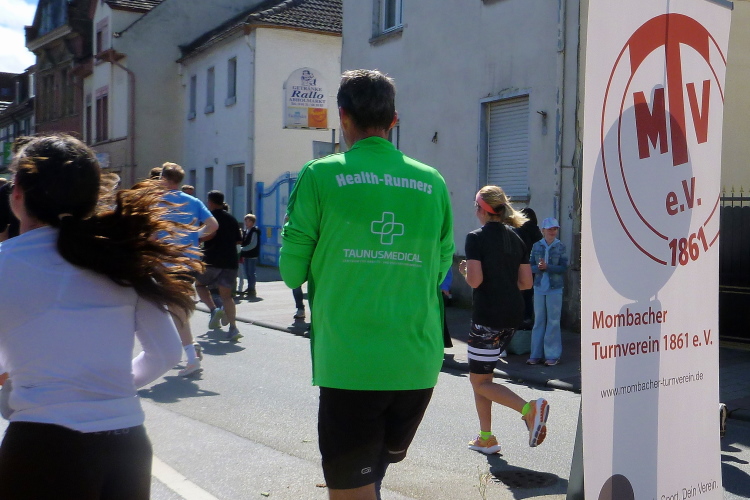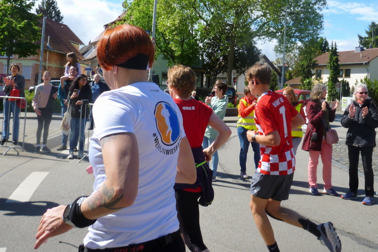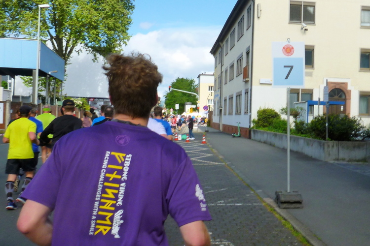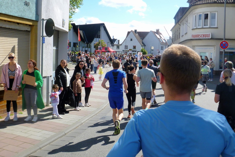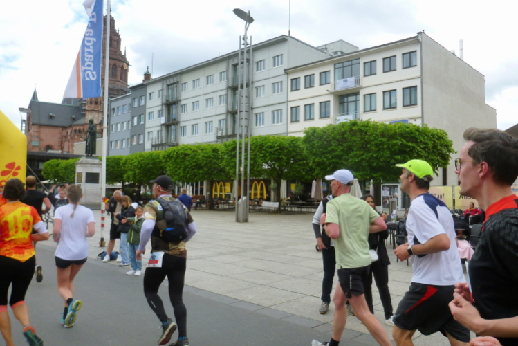Mit Kilometer 10 erreichen wir auf der Hauptstraße den Ortskern von Mombach. Die Zuschauer stehen teilweise in Zweier- und Dreierreihen beidseitig an der Strecke. Sogar ich als alter Hase bekomme Gänsehaut, ob der super Stimmung. Gerne klatsche ich viele Kinderhände ab. Gleich danach können wir wieder verpflegen. Ein Läufer fällt mir wegen seines Trikots auf, das mich an die Einsatzkleidung der Feuerwehr erinnert. Tatsächlich gehört der Wolfgang als „Hunderzwölfer“ der Feuerwehr Hochheim am Main an. Wir laufen an der Alten Lokhalle (Kilometer 11) vorbei und verlassen Mombach.