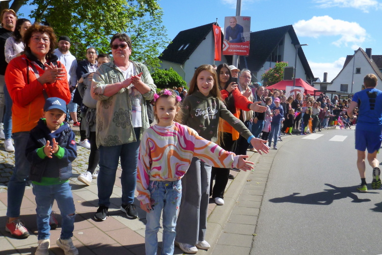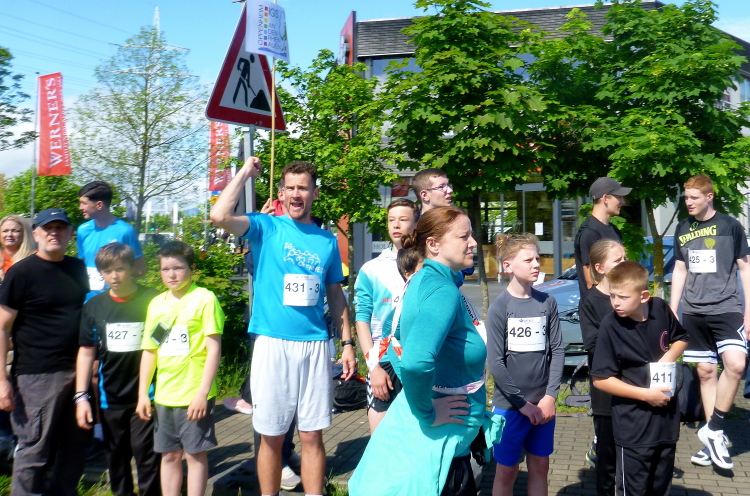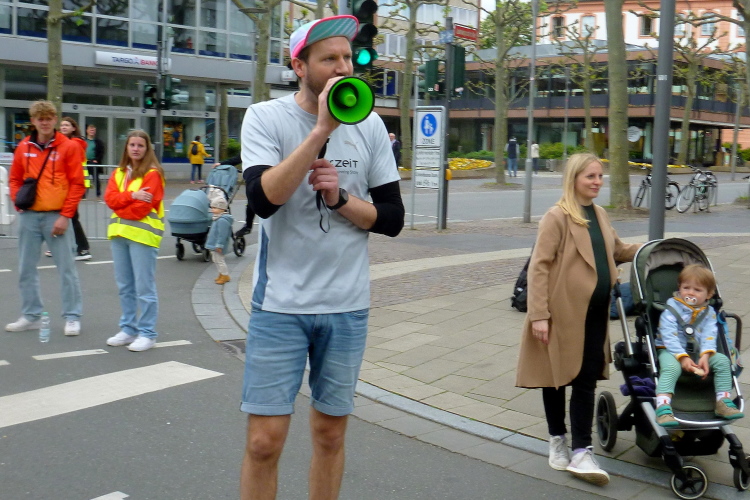 Am Ende des Gegenverkehrsbereiches wechseln erneut die Schülerstaffeln auf den fünften und letzten Läufer. Es geht in die Bauhofstraße und gleich danach in die Große Bleiche, auf der wir vor gut einer Stunde den ersten Kilometer hinter uns gebracht haben. Die Zuschauer sind noch alle da, keiner hat sich verkrümelt, super.