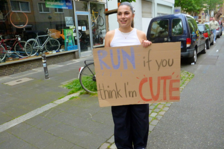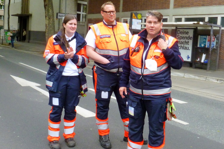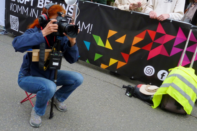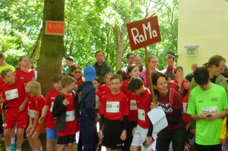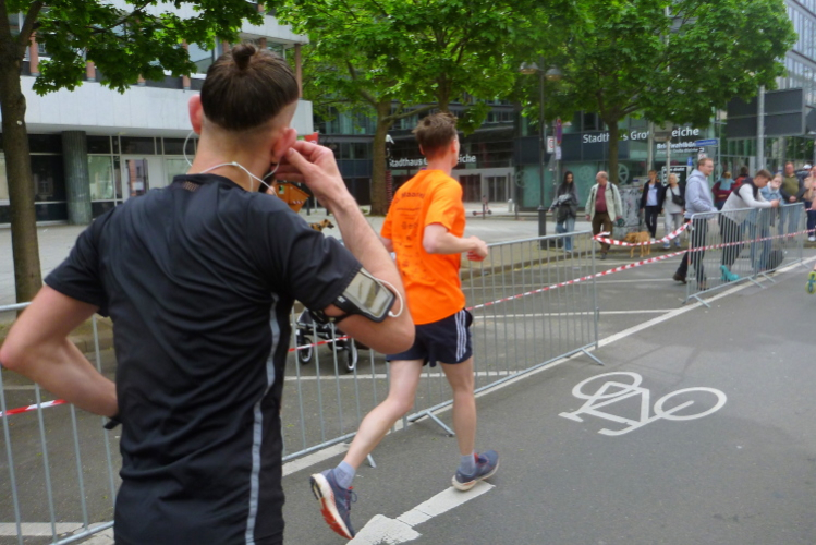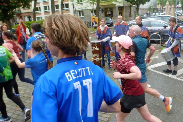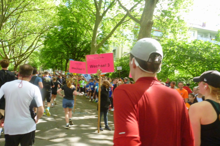 Es folgt auf dem Barbarossaring eine etwa einen Kilometer lange Gegenverkehrspassage, die nur durch einen Grünstreifen in der Straßenmitte getrennt ist. Sömmeringstraße, der Kurs führt nun durch ein Wohngebiet, die Fahrbahnbreite hat sich verschmälert, ich muss wieder mehr aufpassen. Dann erneut ein Wechselpunkt der Schülerstaffeln, jetzt ist da schon mehr Betrieb. Ich sehe frische Kräfte, die mit Vollgas aus dem Wechselbereich heraussprinten.