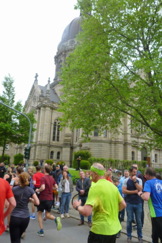 Der Untergrund wird kurzzeitig schwieriger zu belaufen, da in dem Wohngebiet die Kreuzungsstellen höher errichtet wurden, um das Tempo der Autofahrer zu reduzieren. Ich sehe einige, die die Unebenheiten nicht sofort bemerken und ins Stolpern kommen. Mit Kilometer 15,5 erreichen wir die Kaiserstraße, die vor dem Hauptbahnhof liegt. Diese ist voll gesperrt und wir sammeln durch zwei Wendepunkte ebenfalls zwei Kilometer. Im Nordteil sehe ich rechts die Evangelische Christuskirche, die von 1896 bis 1903 erbaut wurde.