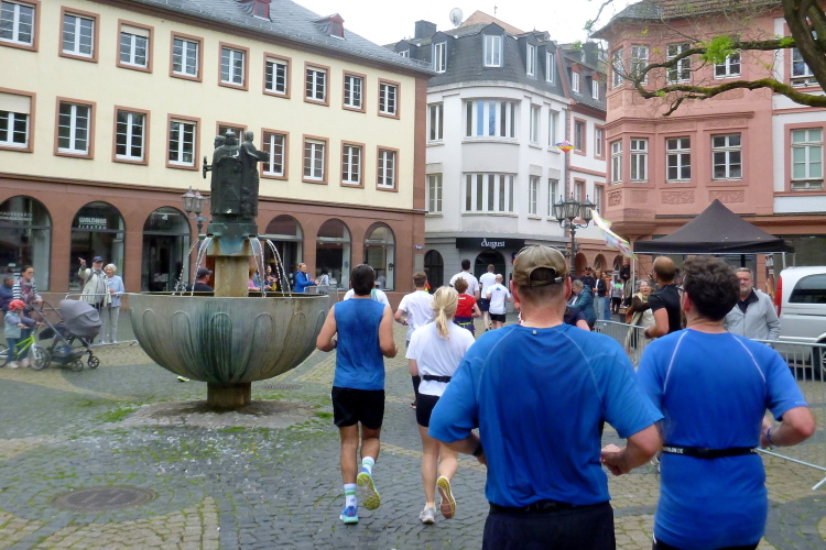 Nach 500 Metern dreht der Kurs nach links in die Große Langgasse, wo uns bereits die ersten Musikbands wie die Meenzer Rhoigeister oder artisan groove Beine machen. 21 Gruppen sind verpflichtet worden, vielleicht spielen auch einige nur für Bier und Brotzeit, so genau wissen wir es nicht. Auf jeden Fall wird es musikalisch nicht langweilig werden. Auf Höhe des Schillerplatzes sehe ich Kilometerschild 1, knapp sechs Minuten bin ich unterwegs, ich habe meine App beim Starttransparent auf Go gedrückt. Die Gruppe mit dem Zwei-Stunden-Pacern zieht langsam davon.
