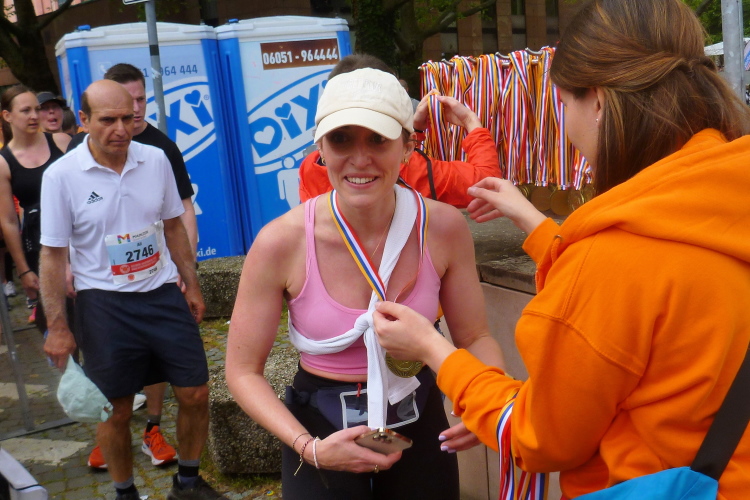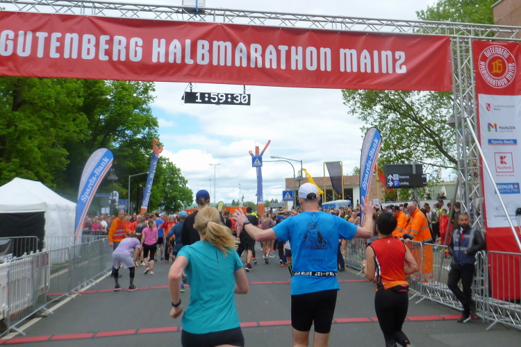 Ich gebe mir nochmals einen Ruck für den Endspurt und überquere nach einigen Sekunden die Zeitmessmatten. Oben auf der Uhr sehe ich eine 1.59.30 Stunden als Bruttozeit. Ich bin überrascht, denn ich hatte mir mehr als 2 Stunden gerechnet. Die 2Stunden-Pacer kommen kurz nach mir ins Ziel.