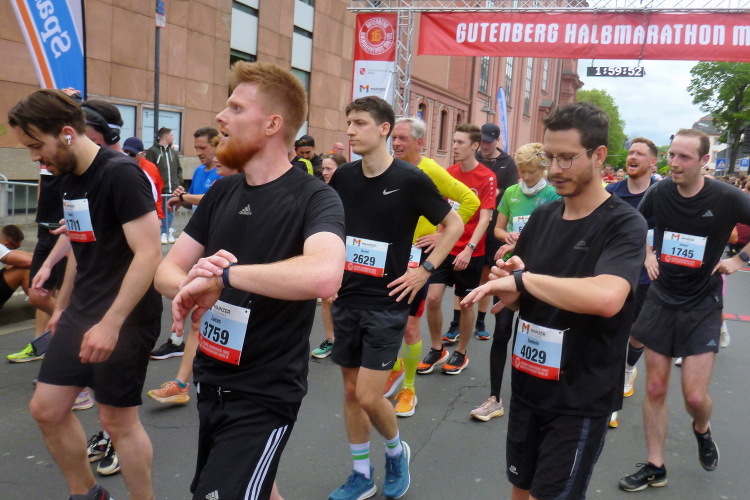 Ich sehe vier Blockeinteilungen, die sind aber nicht einfach mit A, B oder C gekennzeichnet. Schließlich sind wir in Meenz und die Mainzelmännchen sind allgegenwärtig. Die Blöcke sind also nach Anton, Berti, Conni und Det genannt. Wenn nächsten Jahr noch ein paar Tausend Läufer nachkommen, werden die nächsten Startblöcke Edi und Fritzchen genannt.