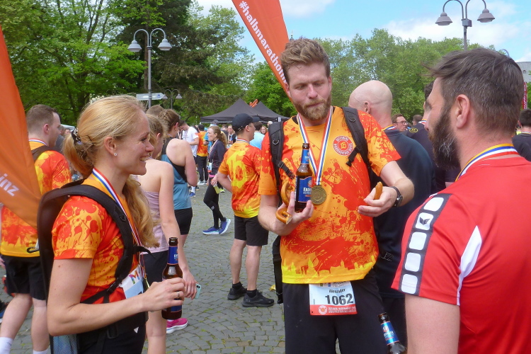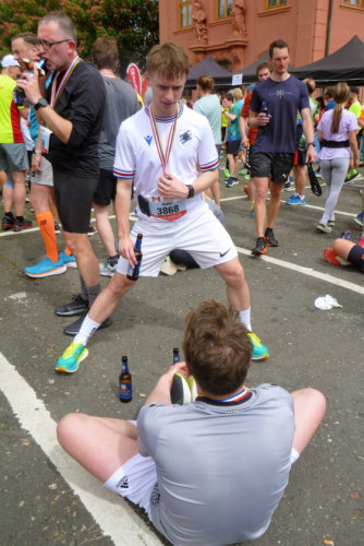 Nach einigen Augenblicken marschiere ich Richtung Verpflegungsbereich, wo wir die Medaillen umgehängt bekommen. Auch im abgesperrten Versorgungsbereich ist es sehr eng, da sollte man etwas nachbessern. Nichts zu meckern gibt es an der Verpflegung, wir erhalten Brezen, Wasser, Iso, Riegel und weiter hinten beim Erdinger Bier in allen Variationen, nur kein „Gscheites“ mit Umdrehungen. Es ist und bleibt halt trotz der Festival-Stimmung ein Sportevent.