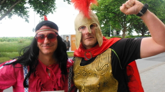 Als echte Meenzer können wir nun auch keinen Gutenberg-Marathon verpassen. Biggi macht in Mainz-Kastel wie üblich bei den Streckenposten ihren Dienst am Läufer und ich, der Sascha, gehe kostümiert als Pheidippides mit Musikanlage auf dem Rücken auf die Strecke, um mir mindestens den neuen Zieleinlauf für den 2/3 genauer anzusehen.
