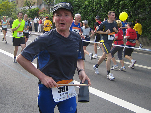 Ein anderer Spaßläufer ist Stefan Müller vom Skiclub 1930 Bingen, der nach dem Motto „Minimax“ läuft: 30 km betrug die gesamte Vorbereitung, nicht etwa pro Woche! Es reicht für 1:59:01. Auf meinen skeptischen Blick hin ergänzt er: Eigentlich bin ich Skater. Na also. Wurden hier die physikalischen Gesetze doch nicht außer Kraft gesetzt. Und ein Charmeur der besonderen Art ist Thomas Blüchel aus Mainz mit seinem Gruß an alle Mütter auf seinem T-Shirt: „Muttertag – Nein danke!“