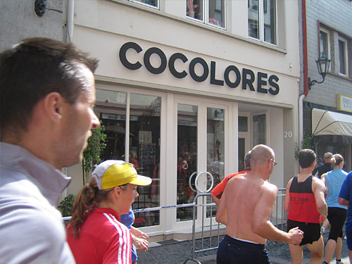 Später dann in Mombach spielen in kurzen Abständen drei Musikgruppen auf, weitere folgen auf dem Weg in die Altstadt. In der Kapuzinerstraße fällt mir ein Geschenkartikelladen mit der Firma „COCOLORES“ auf. Mir erklärt später ein Läufer aus Kolumbien, dass das Wort für „Leben mit Farben“ steht. Ja, bunt ging es in Mainz zu. Passt gut zum Marathon.