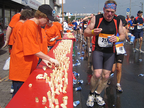 Und auch nach dem Überqueren der Ziellinie stimmt alles. Reichhaltige Verpflegungsstände im Ziel runden das Bild ab. Und nach dem Duschen ist Relaxen am Rhein angesagt.