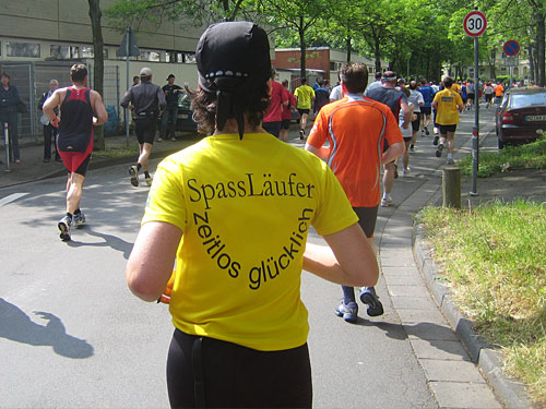 Dann treffe ich auf Dirk Weingarten von Jetzt-Erst-Recht.com, einem neu gegründeten Jura-Repetitorium. Nein, heute ist juristischer Rat nicht gefragt, alles läuft und klappt prima. Run and fun ist die Devise. Bestes Beispiel ist Marion Theis, die „zeitlos glückliche Spaßläuferin“ im knall-gelben T-Shirt mit der Startnummer F673. Sie schafft den Halben in 1:58.