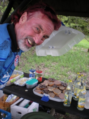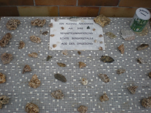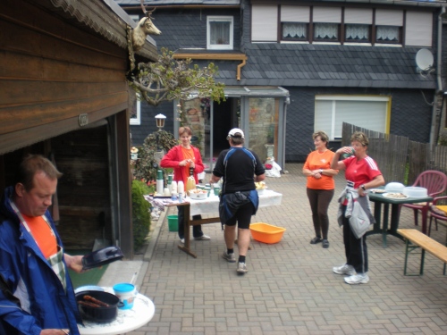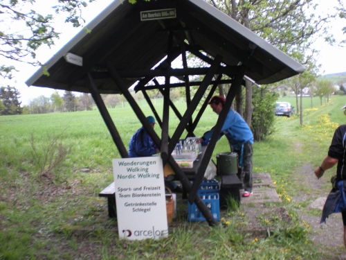 Am Orteingang Steinbach wird die B 85 (Bier- und Burgenstraße) überquert. Ich träume von einem kühlen Bier, da komme ich auch schon zur Verpflegungsstelle am Hotel "Rennsteig" (km 21,6). Wienerwürstchen mit Senf und Brot, dazu zwei kalte Köstrizer, eine Fettbemme und ein Brot mit Blutwurst. Der Tag ist gerettet, doch Tanja und Christian haben mich eingeholt.