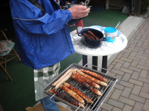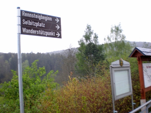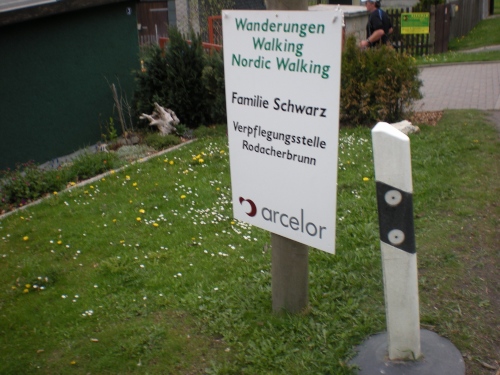 Nach 2,5 km durch den Wurzbacher Forst erreicht man die Verpflegungsstelle Rodacherbrunn, die von der Familie Schwarz betrieben wird. Hier bin ich gerettet, denn außer dem wichtigen Schwarzbier gibt es gute Thüringer. Tochter Schwarz kommt alljährlich angereist, um den Eltern hier bei der Rennsteigwanderung zu helfen. Laut schimpfend kommandiert sie ihre Eltern rum. Ich grinse, es ist perfekt.