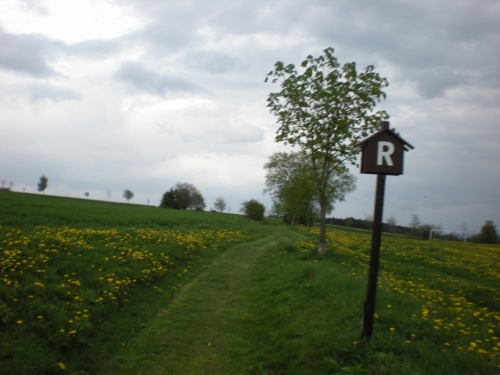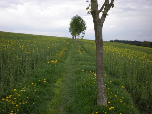 Christian lädt sich einen Berg Kuchen auf die linke Hand und scheucht mich drohend durch das Waldgebiet "Hohe Tanne" (720 m). Der Rennsteig überquert die Straße an der Kompostieranlage in Richtung Grumbach und führt über das Feld nördlich des Ortes. Christian immer noch mit Kuchenstückchen hinter mir, laut hustend, wenn er den Puderzucker einatmet.