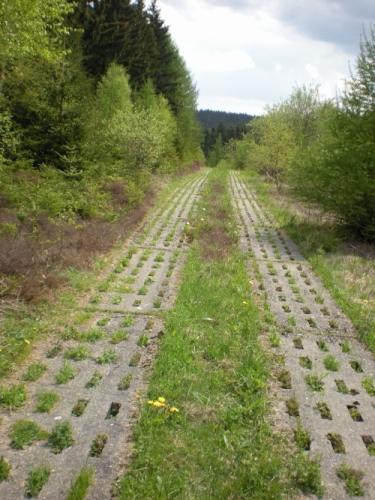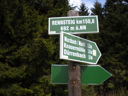 Unterhalb des Wetzsteins (mit 792 m höchster Gipfel der Region) geht es weiter, insgesamt 7 mal überschreitet der Rennsteig in seinem östlichen Teil die Grenze zwischen den Freistaaten Bayern und Thüringen. Die Sperranlagen des ehemaligen Todesstreifens lassen sich oft nur noch erahnen. Gut erhalten ist aber an den meisten Stellen der aus speziellen Betonelementen bestehende Kolonnenweg der DDR-Grenztruppen.
