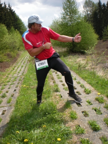 Die Strecke führt weiter die Straße entlang bis zur nächsten Getränkestelle in der "Hab- Acht- Kurve" (km 16,9). Von hier aus wird der auf 8 km der Radweg rechts der Frankenwaldhochstraße (Richtung Steinbach) genutzt. Man kann zwar hier wunderbar laufen, aber leider ist hier ein Stück alter Rennsteig von den Bayern in eine trostlose Asphaltlandschaft verschandelt worden. Aber wenigstens habe ich wieder die Marschierer eingeholt. Dafür überholen mich aber wieder andere Stöckchenschwinger. Beeindruckendes Tempo, alle Achtung. Sigrid und Hajo laufen etwa einen Kilometer vor mir. Ich laufe, falle aber etwa auf Platz 19 zurück.