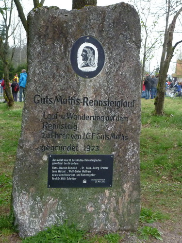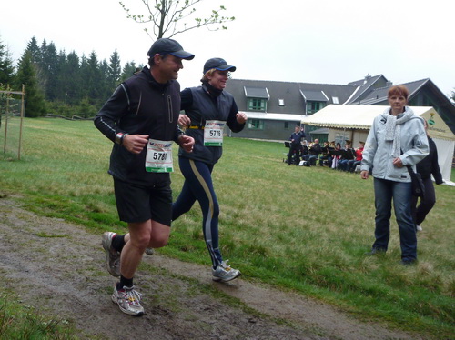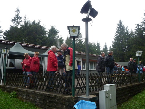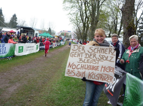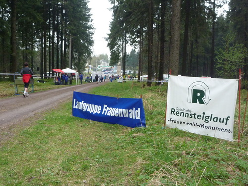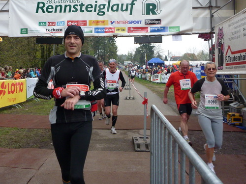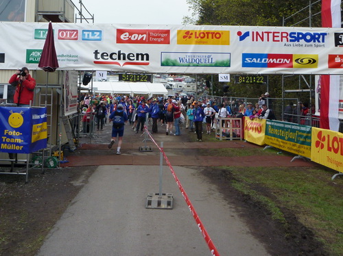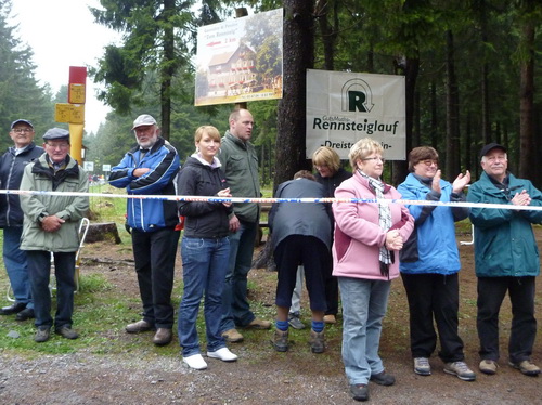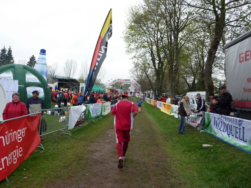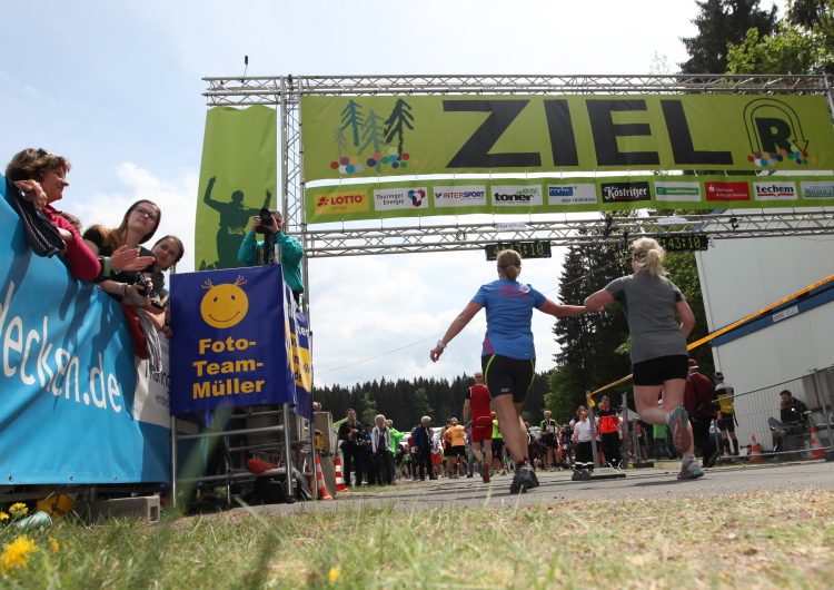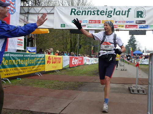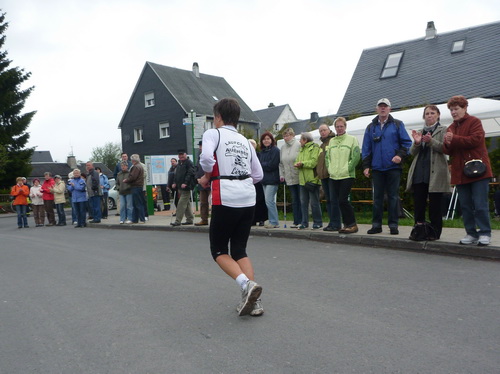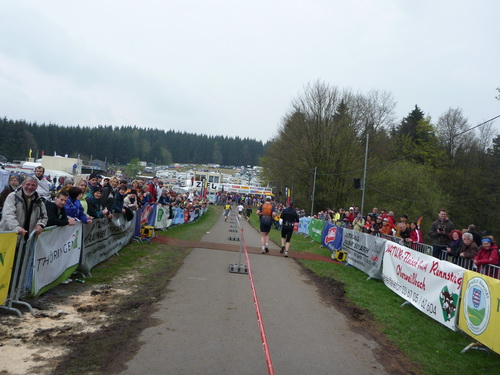 Der Ort ist ein einziger Parkplatz, überall stehen Autos und Busse. Jetzt kommt der letzte Anstieg, hinauf zum Sportplatz. Die Zuschauer treiben Dich nach oben. Die Reihen werden immer dichter, oben ist nur noch eine schmale Gasse frei. Dann kommt das nach Meinung vieler „schönste Ziel der Welt“. Der Sportplatz gleicht einem Rummelplatz mit Bier- und Imbissbuden. Auf einem holprigen Wiesenweg umrundet man fast das ganze Gelände, immer wieder angefeuert von den vielen Zuschauern. Dazu Musik. Kein Beat, kein Rock. Stimmung ist angesagt, Rennsteig-Pop. Es ist der Hammer. Überall würdest Du Dich fragen: „Haben die nichts anderes?“. Hier gehört es hin, hier muss es sein. Der Holperweg ist lang und doch viel zu schnell zu Ende.