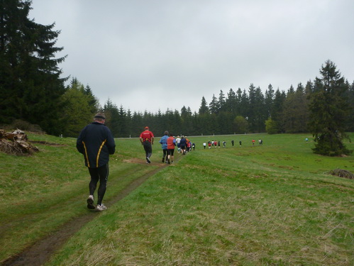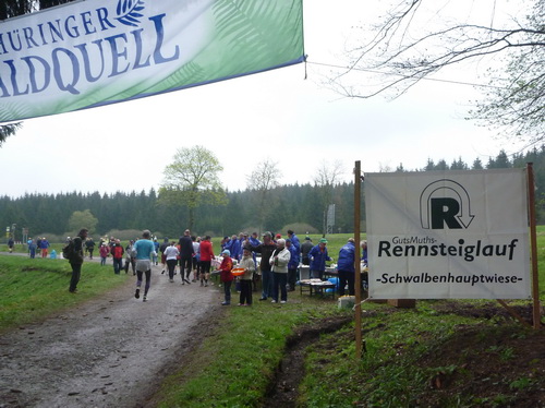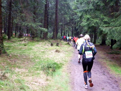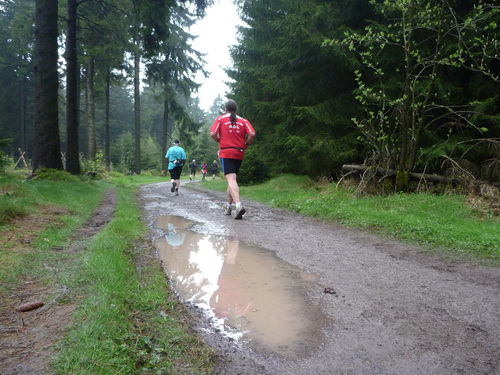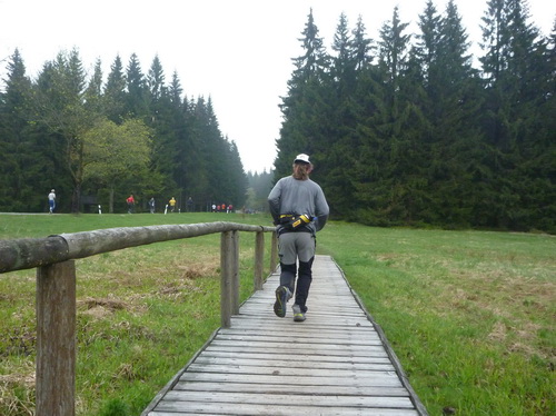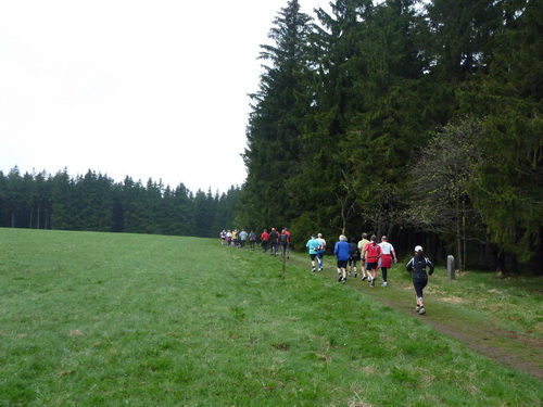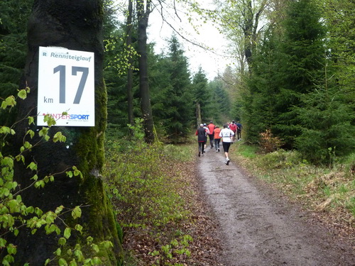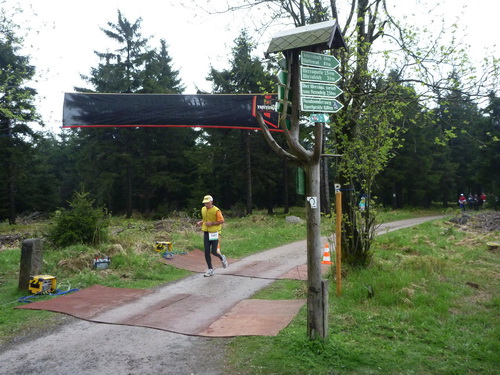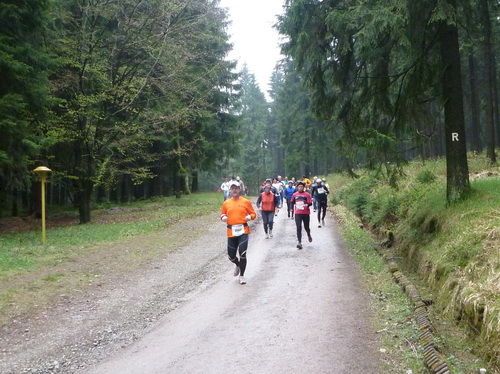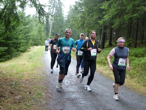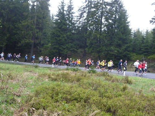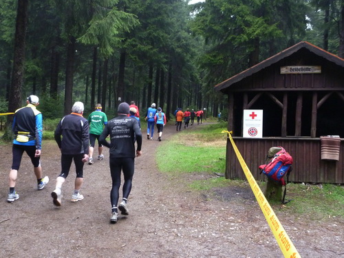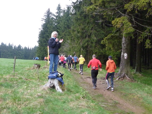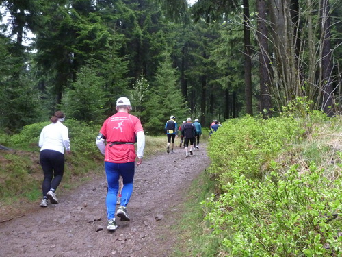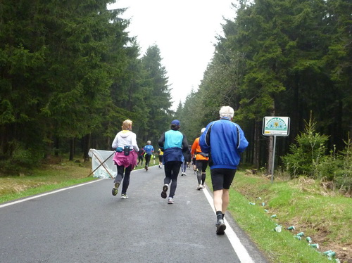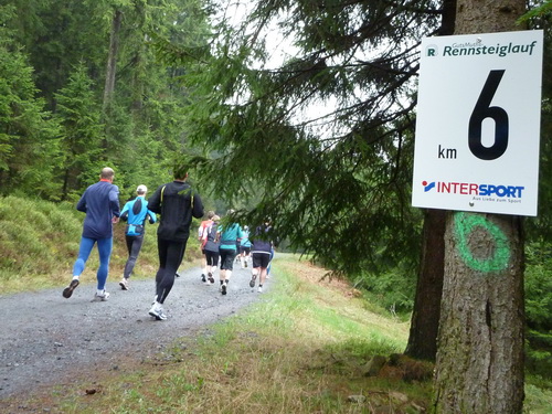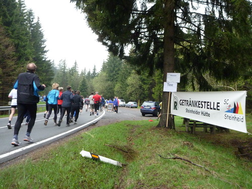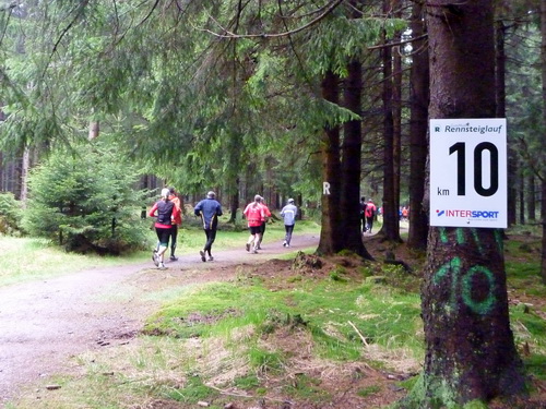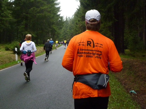 Sechs Kilometer läuft man auf der B 281 in Richtung Eisfeld. Das ist gut so, denn das große Läuferfeld muss sich verteilen, ehe es auf den Rennsteig geht. Rechts ist die Getränkestelle bei der Steinheider Hütte, dann ist der Rennsteigläufer in seinem Element. Der Weg ist zwar noch breit, aber steinig. Und dass es dauernd mal rauf, mal runter geht, sage ich jetzt einmal, dann nicht mehr. Denn es bleibt so, summa summarum 637 m bzw. 706 m. Nur manchmal ist es steil wie bei Limbach, dann geht man halt wie die meisten hier.