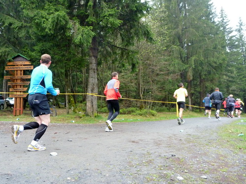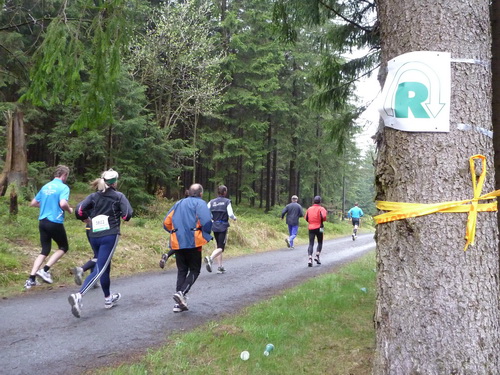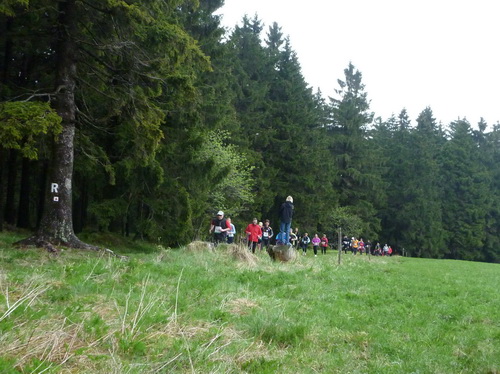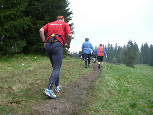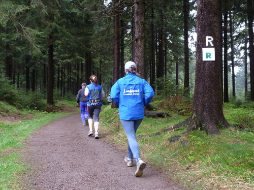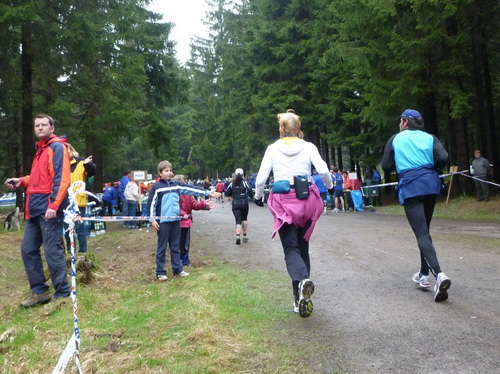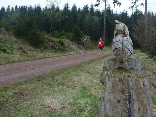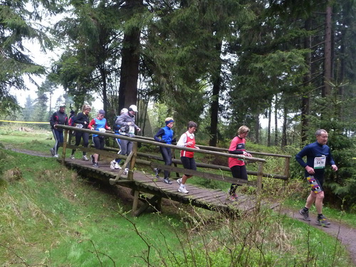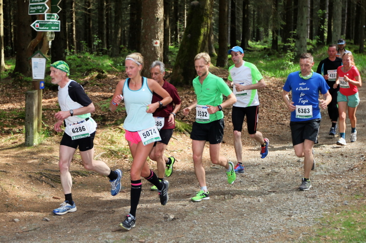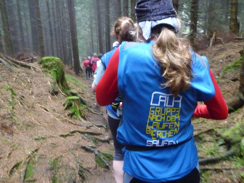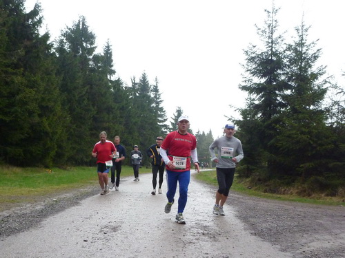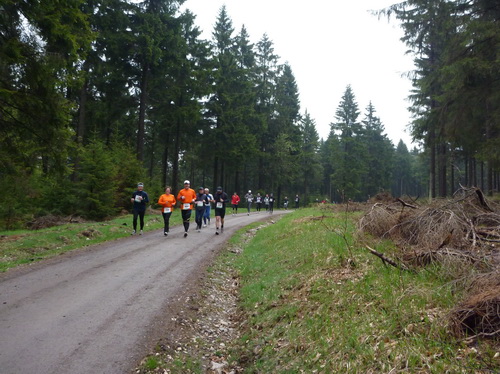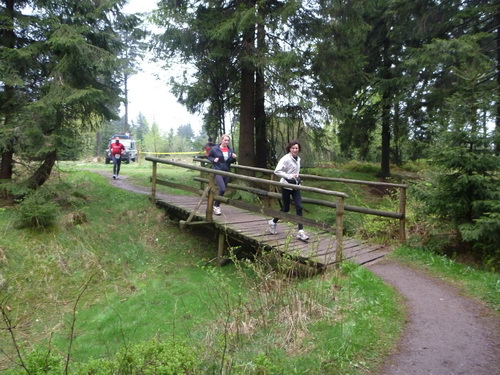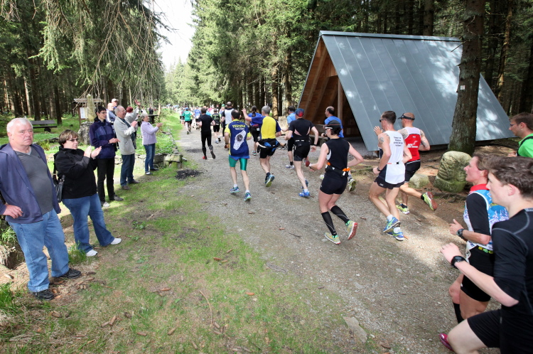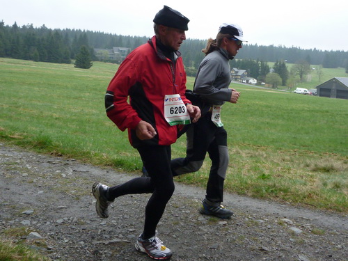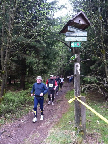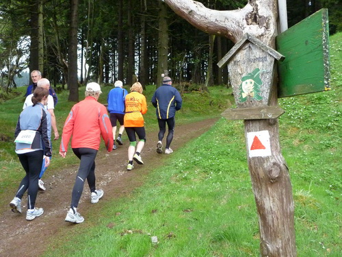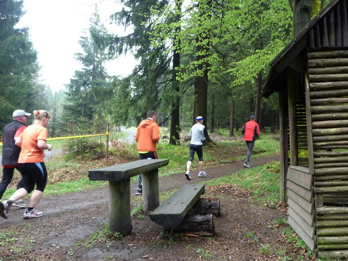 Sechs Kilometer läuft man auf der B 281 in Richtung Eisfeld. Das ist gut so, denn das große Läuferfeld muss sich verteilen, ehe es auf den Rennsteig geht. Rechts ist die Getränkestelle bei der Steinheider Hütte, dann ist der Rennsteigläufer in seinem Element. Der Weg ist zwar noch breit, aber steinig. Und dass es dauernd mal rauf, mal runter geht, sage ich jetzt einmal, dann nicht mehr. Denn es bleibt so, summa summarum 637 m bzw. 706 m. Nur manchmal ist es steil wie bei Limbach, dann geht man halt wie die meisten hier.