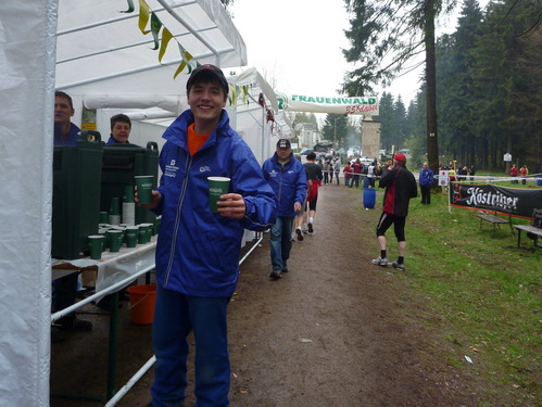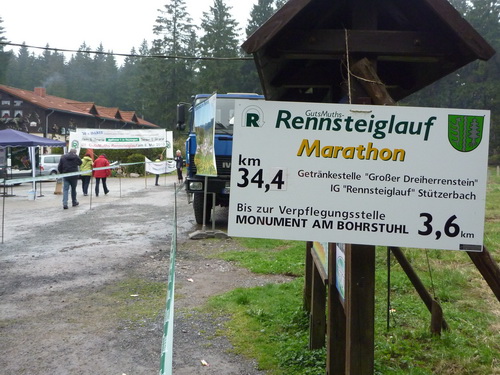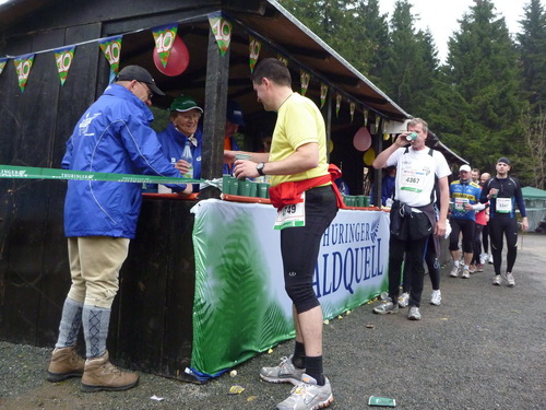 Bevor es hinunter nach Frauenwald geht, gibt es noch einmal einen giftigen Anstieg. Per Lautsprecher wird die Musik von der Verpflegungsstelle hierher übertragen. Danke Leute, Ihr wisst halt wie der Läufer fühlt. Der Sprecher begrüßt schließlich die Ankömmlinge und muntert sie auf. Was der nicht schafft, erledigt das Köstritzer, das hier kistenweise ausgeschenkt wird. Alkoholfrei? Nö, wir sind doch auf dem Rennsteig.