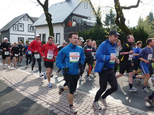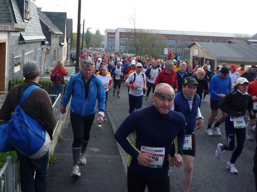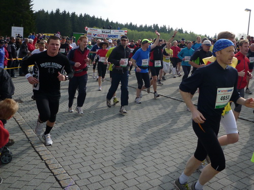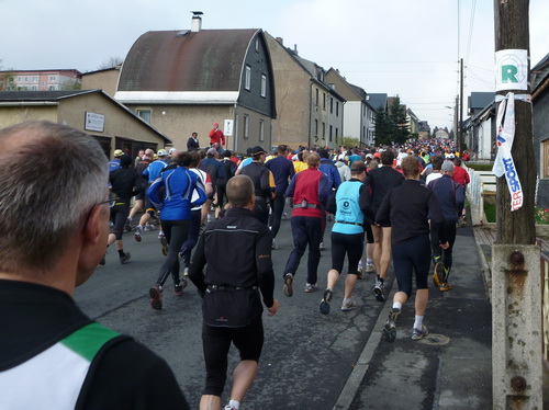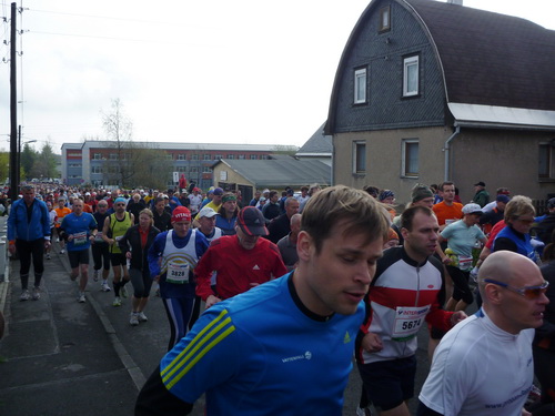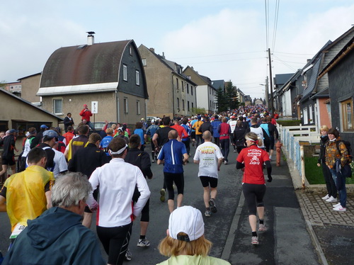 Euphorisiert und beklatscht von vielen Zuschauern rennen die Marathonis los. Merkt denn keiner, dass es nur bergauf geht? Der Rennsteig-Marathon hat deshalb 43,5 km, weil man von der anscheinend tiefsten Stelle des Ortes startet. Würde man oben von der Bahnhofstraße starten, wären es 42,195 km und man hätte eine kräftige Steigung weniger. Aber – es wäre nicht so schön. Lasst alles wie es ist, liebe Organisatoren. Hätten alle Ossis ihre Produkte so erfolgreich in Gesamtdeutschland platzieren können wie Ihr Euren Rennsteiglauf, gäbe es einige Probleme weniger.