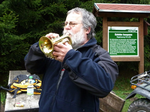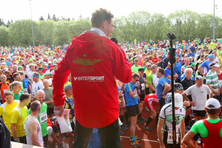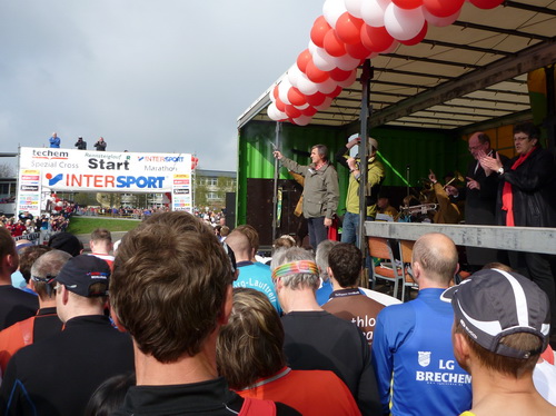 Der Startplatz ist unterhalb der GuthsMuts-Halle. Auf einem LKW hat es sich die Lichter Blasmusik bequem gemacht und begleitet ein Gesangs-Duo, ebenfalls aus einem Nachbarort. Unterbrochen werden ihre Darbietungen vom Sprecher, der mal Falschparker vor dem Abschleppwagen warnt, mal ein verlorenes Handy anpreist und schließlich die regionale Laufprominenz begrüßt. Und damit sind keineswegs etwa Spitzenläufer gemeint, sondern die für den Rennsteiglauf typischen Stammläufer. Es gibt keinen Lauf mit einer ähnlichen „Kundentreue“. Stolz tragen die Jubilare, meist echte Haudegen, Shirts mit entsprechenden Aufdrucken. Von vielen glaube ich, dass sie nur am Rennsteig laufen. Jedenfalls begegnen mir sonst wesentlich mehr bekannte Gesichter.