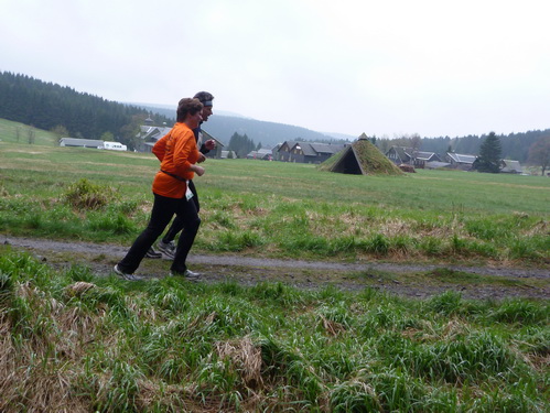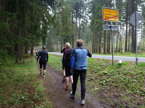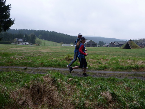 Neuhaus am Rennweg liegt auf 830 m Höhe. Am Freitag regnet es und es ist saukalt. „Mach Dir keine Sorgen, kälter als hier ist es nirgends am Rennsteig“, tröstet mich der Intersport-Verkäufer, als ich ihn nach einer langen Laufhose frage. Er ist nämlich wie ich ganz auf Sommer eingerichtet und hat nur „kurz“ im Angebot. Bei vier Grad eine ganz neue Erfahrung für mich. Nur oben rum bin ich gut eingepackt. Wenigstens scheint am Samstagmorgen die Sonne.