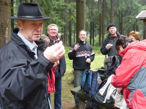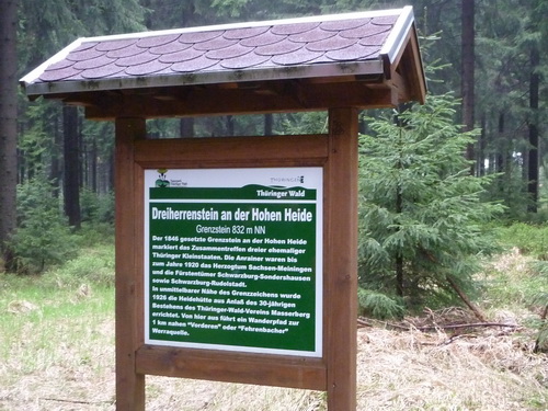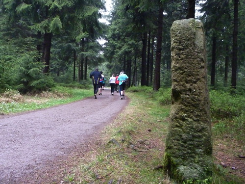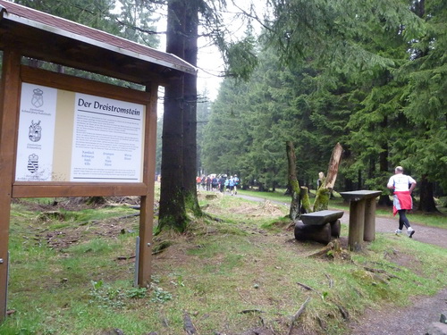 Wir sind bereits voll im Anstieg auf den Eselsberg, mit 841 m der höchste Punkt der Strecke. Keine Angst, die Höhenmeter verteilen sich sehr moderat und die meisten kommen im Laufschritt hoch. Zuvor gibt es bei der Hohen Heide noch den Dreiherrenstein zu bestaunen. Es gibt auf dem Rennsteig über 1000 solcher Grenzsteine, teilweise gehen sie bis ins 15. Jahrhundert zurück. Viele sind wie dieser als Denkmal gekennzeichnet und geschützt. Dreiherrenstein heißt er, weil hier, wie auch an anderen Orten, die Grenze dreier Herzog- oder Fürstentümer zusammenstoßen. Ganz in der Nähe ist auch die Werraquelle.