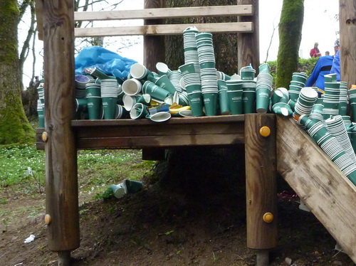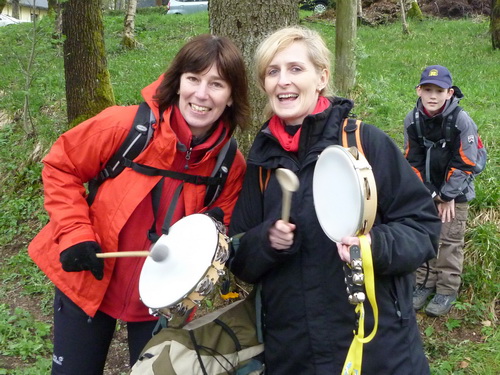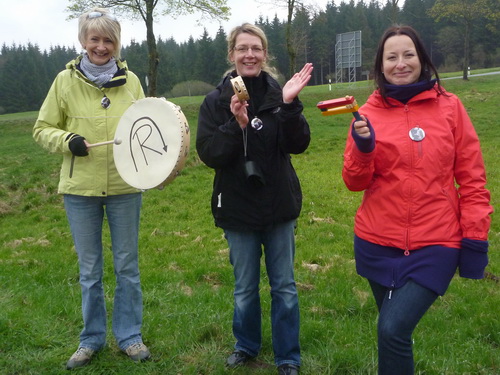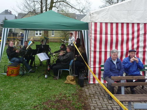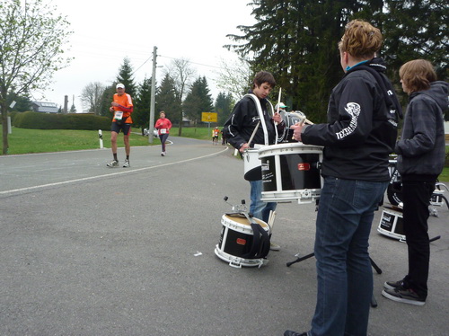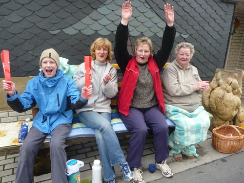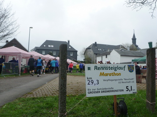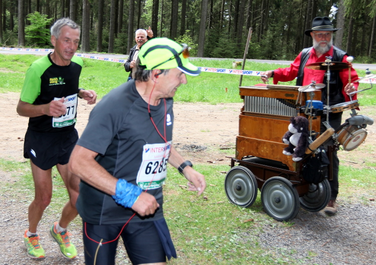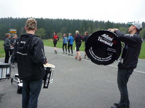 Die Verpflegungsstelle gleicht einem Dorffest, selbstverständlich mit zünftiger Blasmusik. Dann wird es noch einmal recht ungemütlich, denn zum Burgberg ist es ein kurzes Stück ziemlich steil. Laufen ist da nicht mehr. „Einstellig!“, ruft es hinter mir. Stimmt, nur noch 9,5 Kilometer und gleich sind wir bei der Getränkestelle am Großen Dreiherrenstein. Auch der hat seine Geschichte. Davon aber ein andermal. Interessieren würde mich, wie es zu dem Namen Allzunah kommt. So heißt nämlich der Ort bei km 37. Die Trommler wissen das natürlich nicht. Sie wurden hier mit dem Bus her gekarrt, „Stimmung machen“. Sie tun das gekonnt.