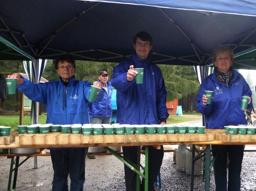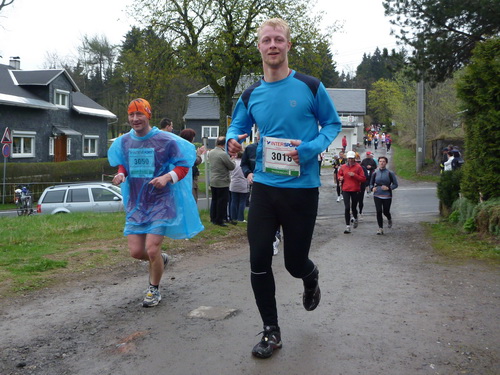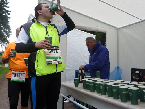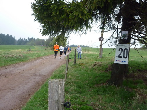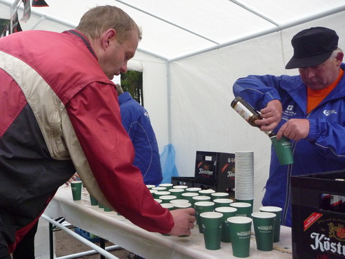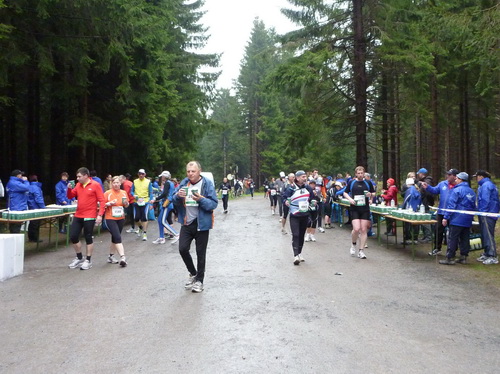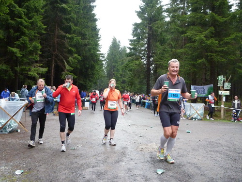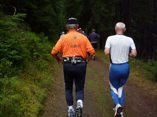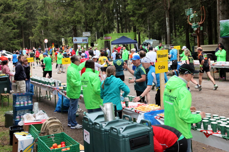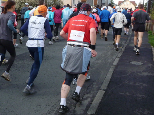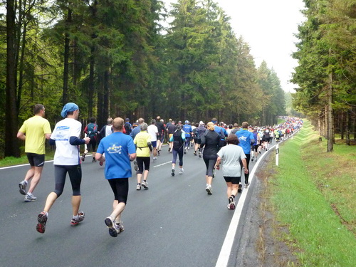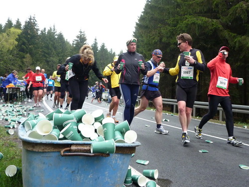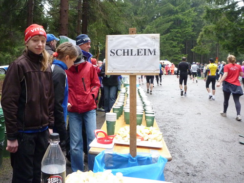 Bei km 11 kommt die erste Verpflegungsstelle. In einem Plan, den jeder Läufer erhält, ist aufgeführt, wo er was bekommt. Dabei muss er auf den legendären Schleim nur selten verzichten. Ich habe an anderer Stelle schon ausführlich darüber geschrieben und bleibe dabei, dass die Bezeichnung das Schlimmste an der (für Wessis) ungewohnten Kraftnahrung ist. Mir schmeckt er heute sogar ausgesprochen gut. Liegt es am Geschmacks-Tuning mit Heidelbeeren oder habe ich einfach keine Vorbehalte mehr?