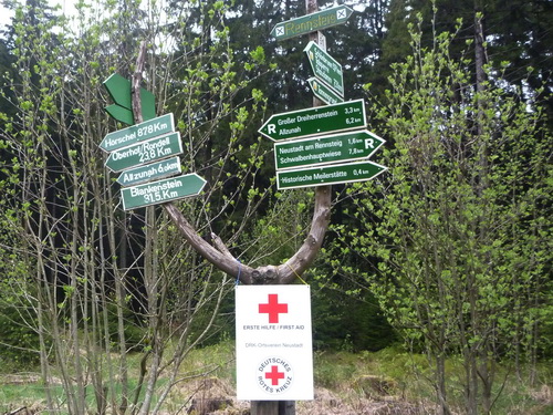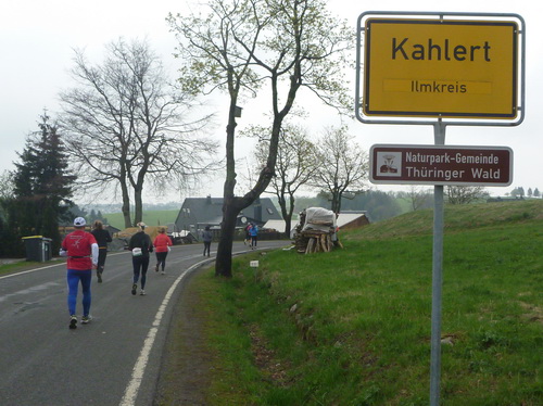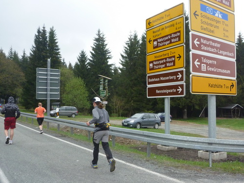 Der Rennsteig verläuft nun parallel zur Fahrstraße Richtung Neustadt. Es ist so viel wie kein Verkehr und viele Läufer nutzen die bequemere Straße. Hinter Kahlert, bis eben spielte hier auch noch eine Musikkapelle, erreicht man eine unbewaldete Hochfläche, von der aus man schon gut Neustadt sehen kann.