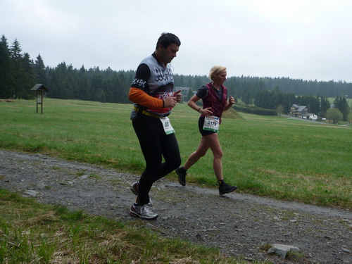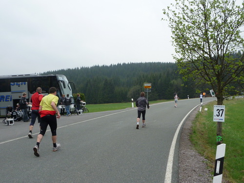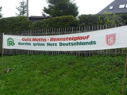 Weiter geht’s. Wir kommen zur Friedrichshöhe. Über die kleine Wohnsiedlung hinweg hat man einen sehr schönen Blick auf den Thüringer Wald. Eine Musikkapelle spielt auf - auch so ein Rennsteig-Phänomen. Während sonst die Landschaftsläufe ja fast ganz unter Ausschluss der Öffentlichkeit stattfinden, stehen hier bei jedem Haus oder jeder Kreuzung Leute an der Straße und feuern die Läufer an. Einer hat von ihnen bestimmt ein Musikinstrument dabei – wie der Bläser bei der Eisfelder Ausspanne.