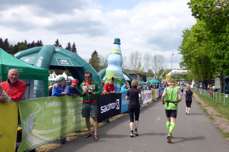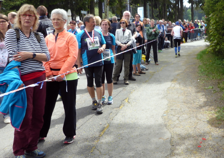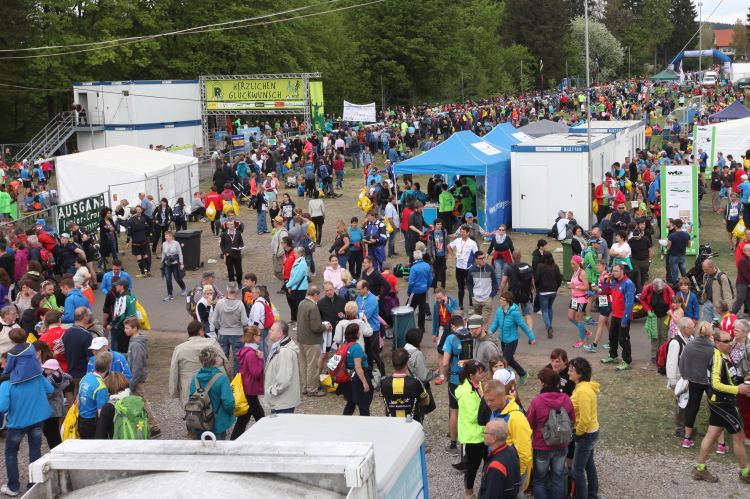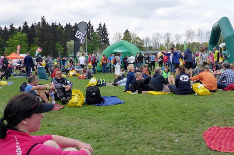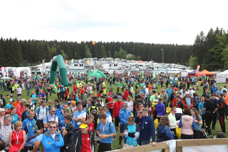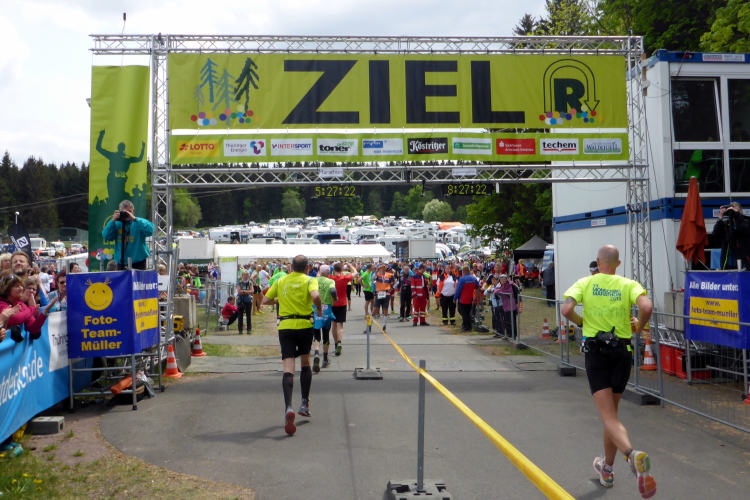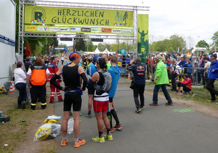 Das ist also das berühmte Ziel in Schmiedefeld. Im Hintergrund sieht man wie aufgetürmt die Wohnwagen auf dem Campingplatz, links und rechts wie auf der Kirmes Imbiss- und Getränkestände. Dazu der Duft von Bratwurst, der Applaus hunderter Zuschauer und die Lobeshymnen des Sprechers für jeden Finisher. Herzlich willkommen im schönsten Ziel der Welt! So wird es behauptet und so empfinde ich es jetzt auch.