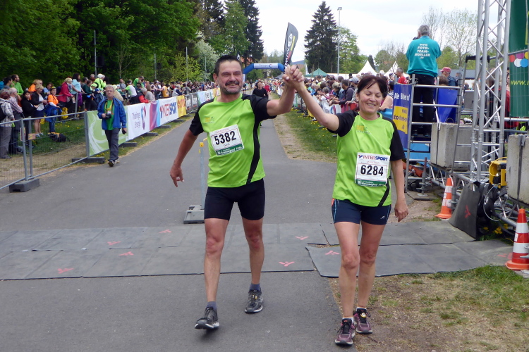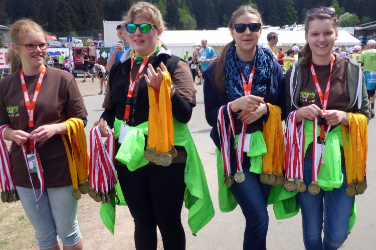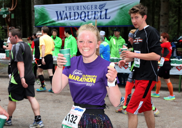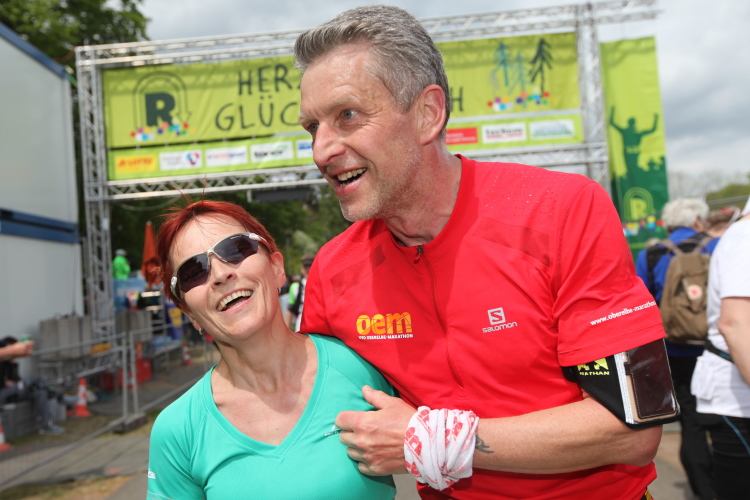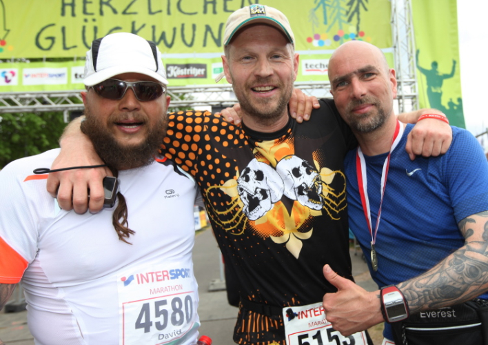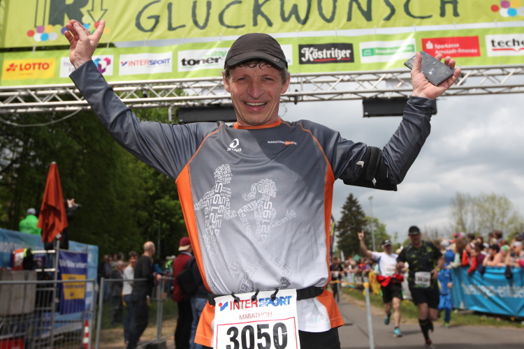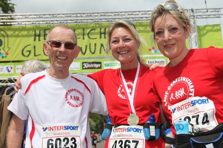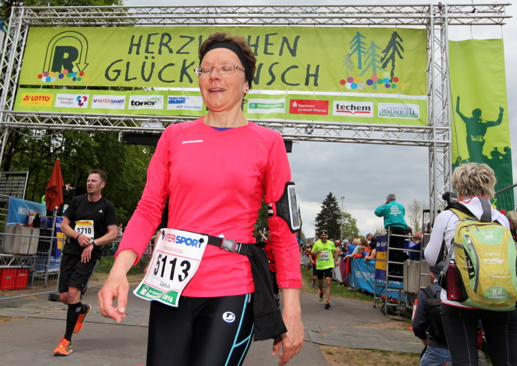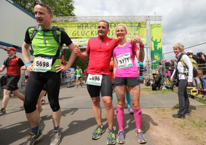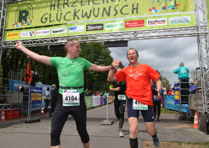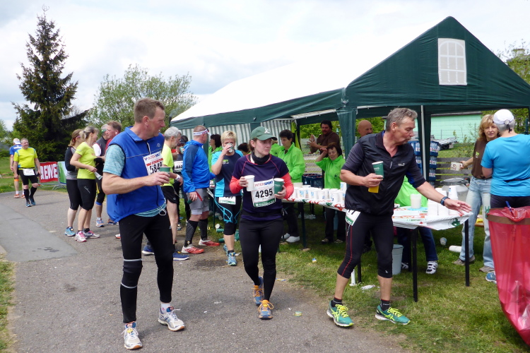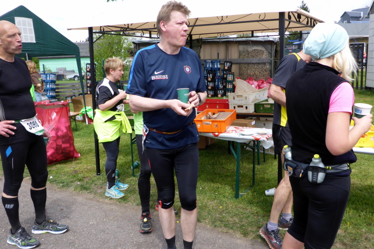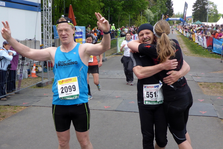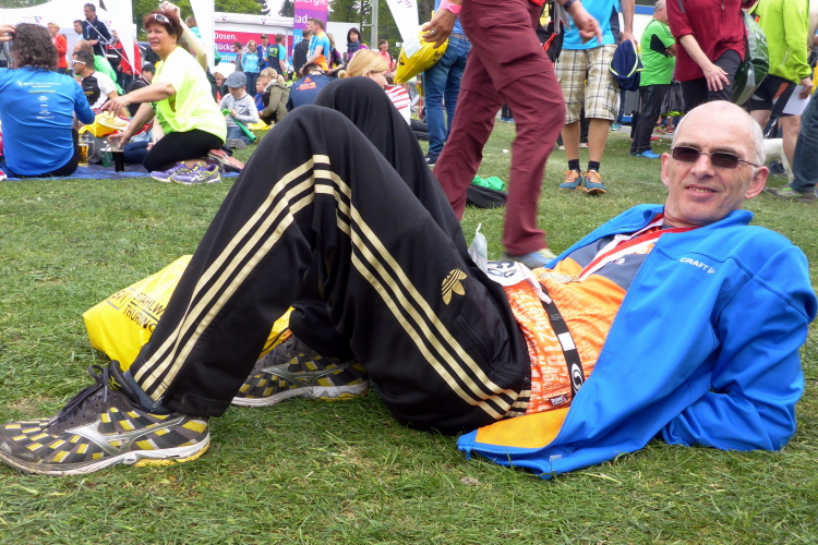 Mit der Medaille um den Hals kann ich kurz darauf auch mit Bernie abklatschen. Er ist eine viertel Stunde vor mir eingelaufen. Nach einer erfrischenden Dusche im riesigen Duschzelt sind wir schnell wieder erholt, gönnen uns Schwarzbier und Thüringer Bratwurst und legen uns zu den anderen Finishern auf der Wiese in die Sonne.