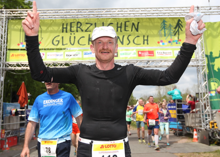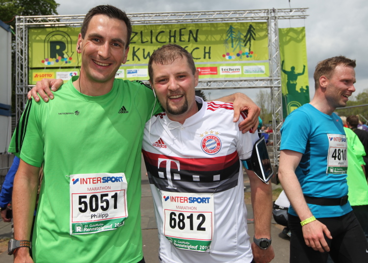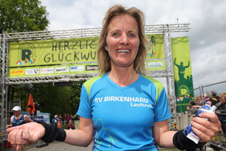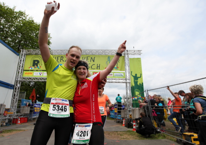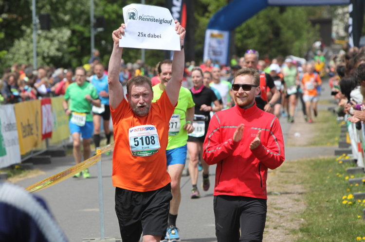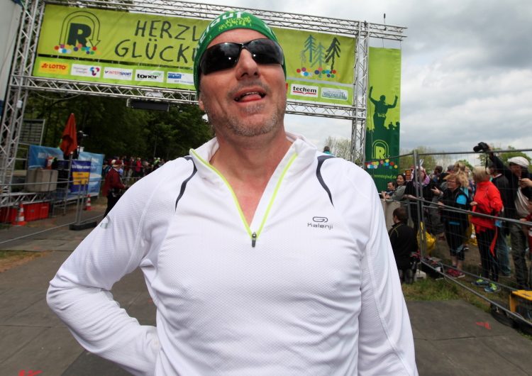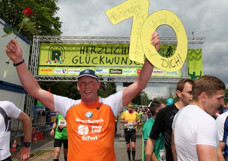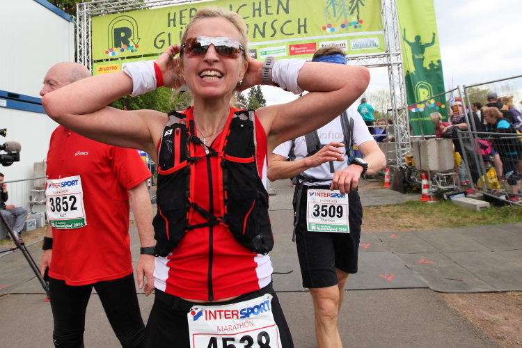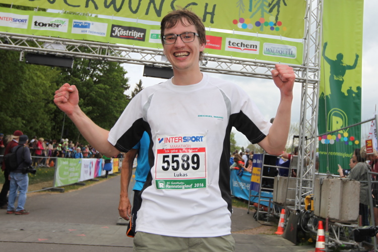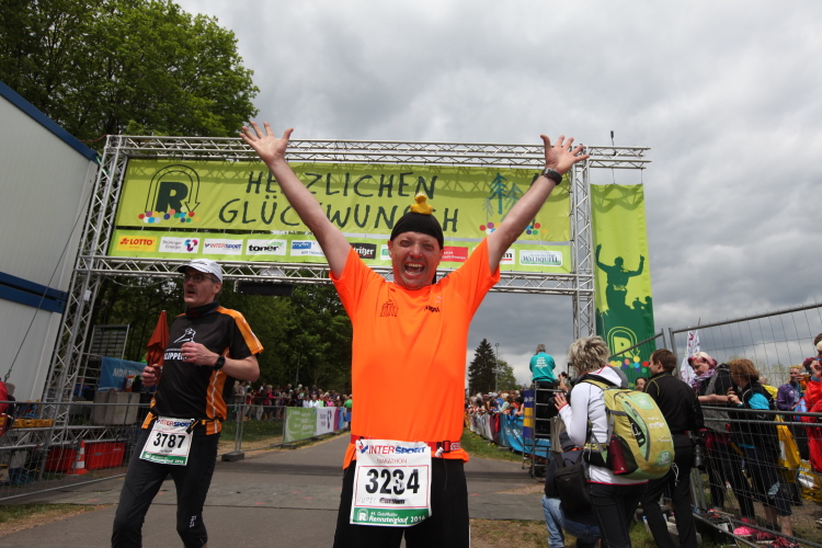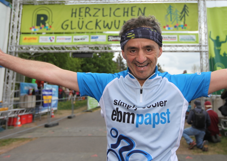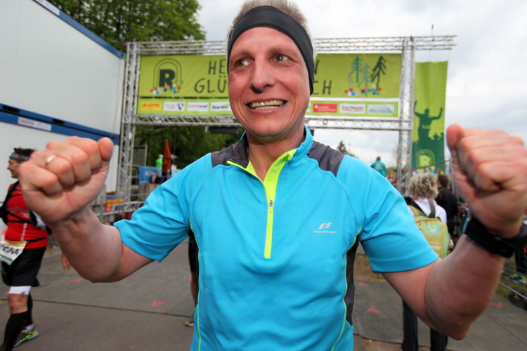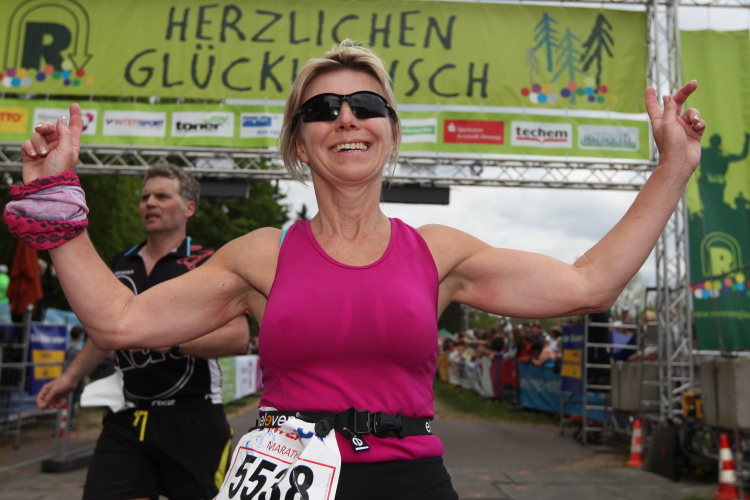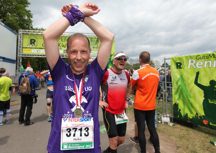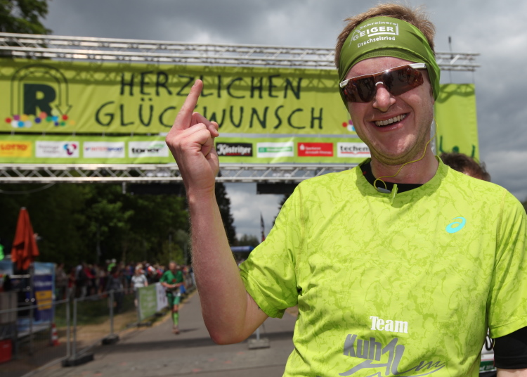 Mit der Medaille um den Hals kann ich kurz darauf auch mit Bernie abklatschen. Er ist eine viertel Stunde vor mir eingelaufen. Nach einer erfrischenden Dusche im riesigen Duschzelt sind wir schnell wieder erholt, gönnen uns Schwarzbier und Thüringer Bratwurst und legen uns zu den anderen Finishern auf der Wiese in die Sonne.