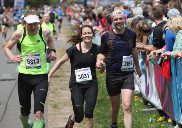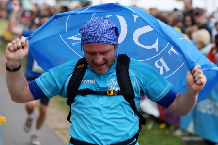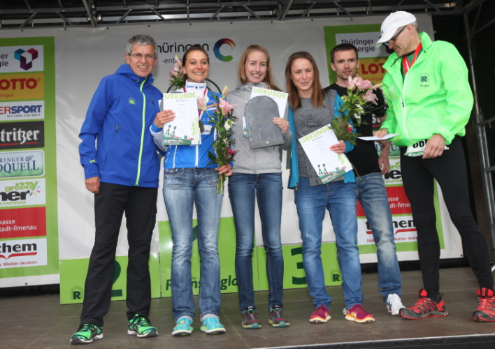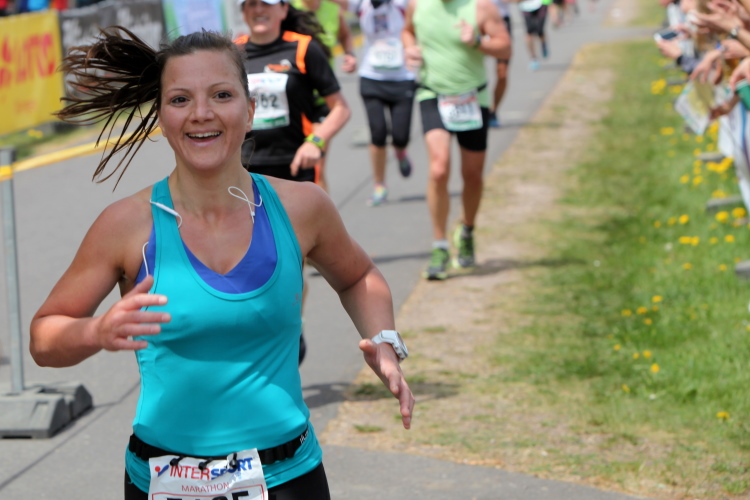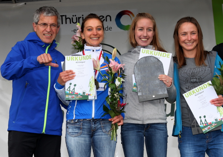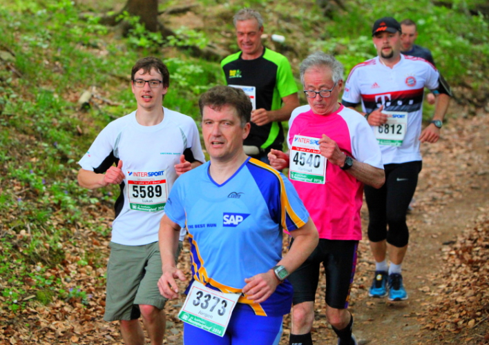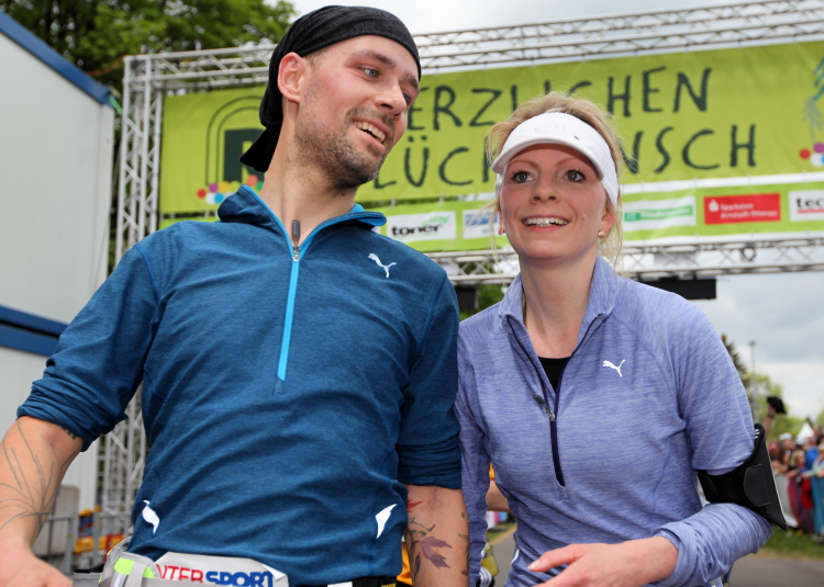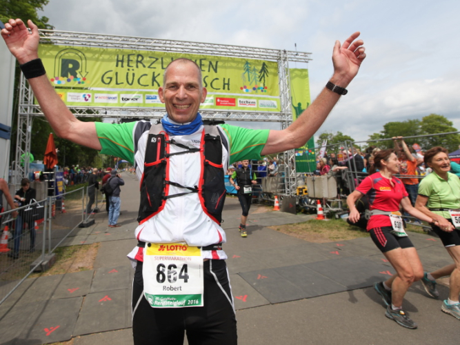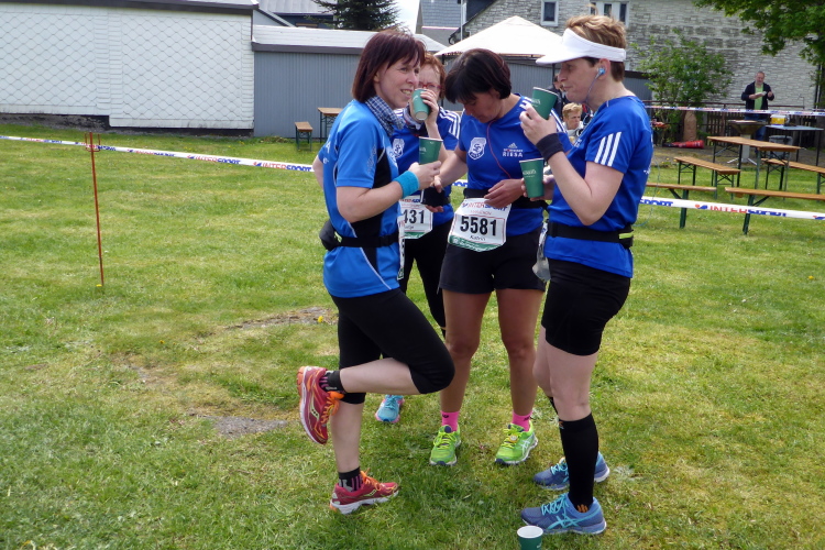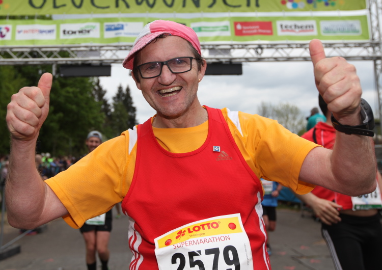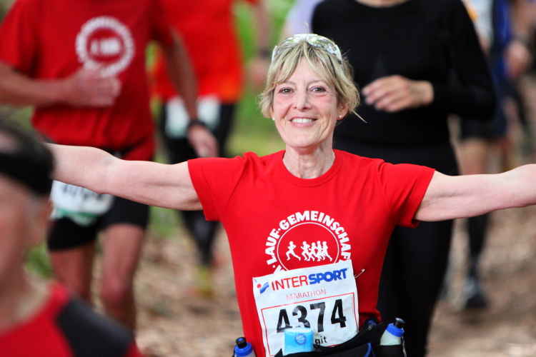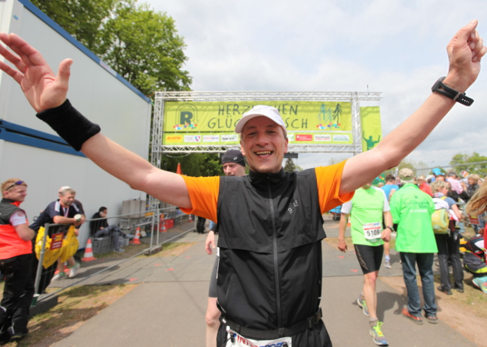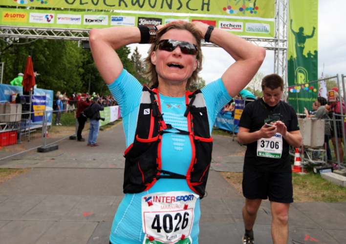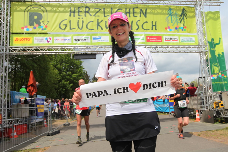 Mit der Medaille um den Hals kann ich kurz darauf auch mit Bernie abklatschen. Er ist eine viertel Stunde vor mir eingelaufen. Nach einer erfrischenden Dusche im riesigen Duschzelt sind wir schnell wieder erholt, gönnen uns Schwarzbier und Thüringer Bratwurst und legen uns zu den anderen Finishern auf der Wiese in die Sonne.
