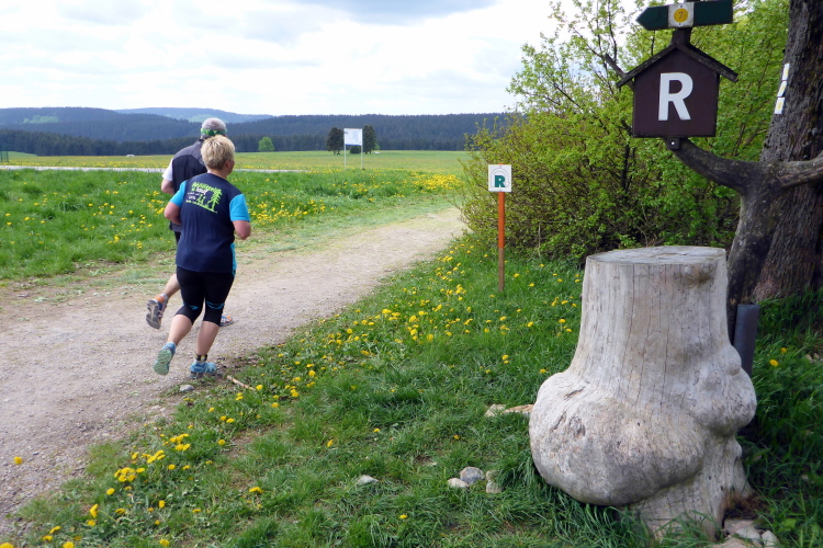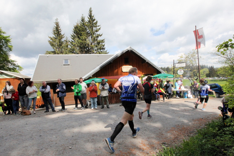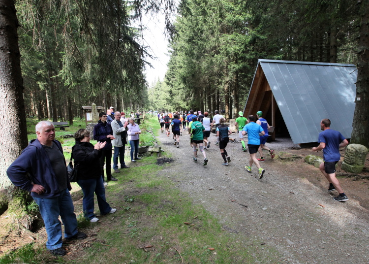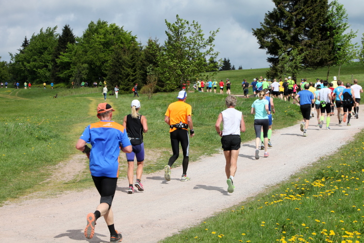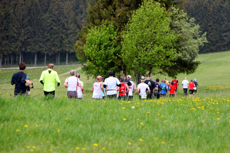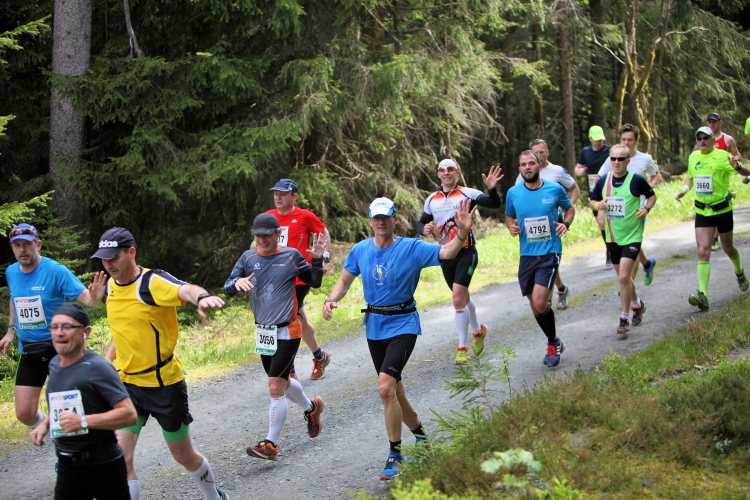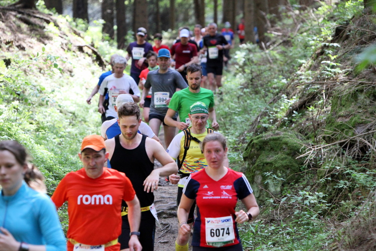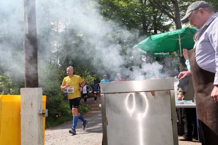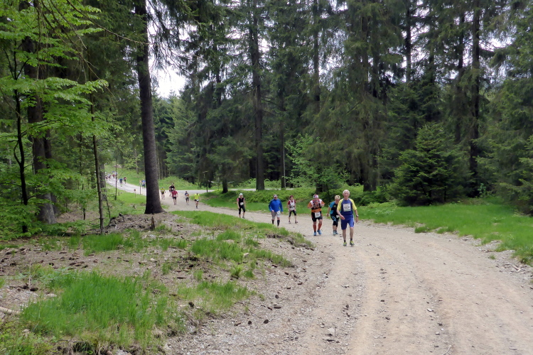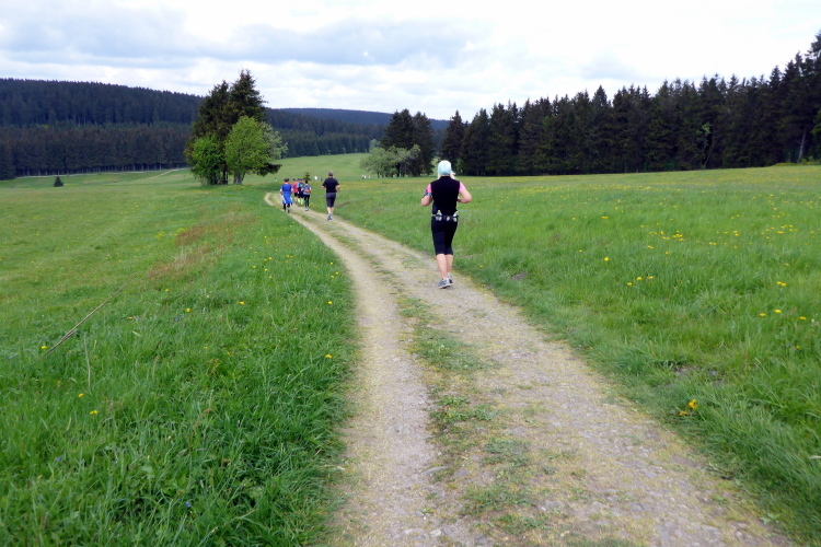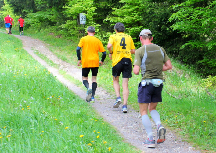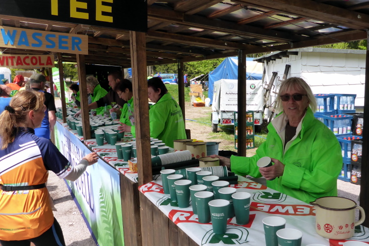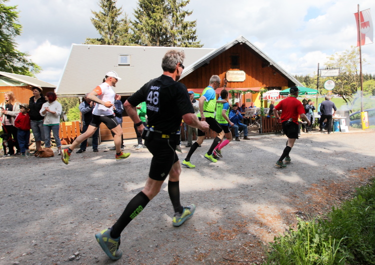 Vor einem kleinen Steg gibt es Stau. Auch in dem folgenden steinigen Hohlweg, an dem jeder Trailer seine Freude hat, geht es nur langsam vorwärts. Macht nichts, es ist eh Vorsicht angesagt. Am Ende erreichen wir die nächste Verpflegungsstation bei Kilometer 22,2 an der Schwalbenhauptwiese. Auch hier greife ich wieder zum Tee.