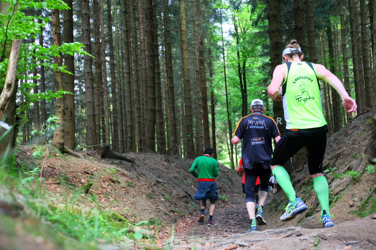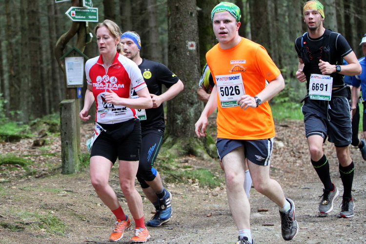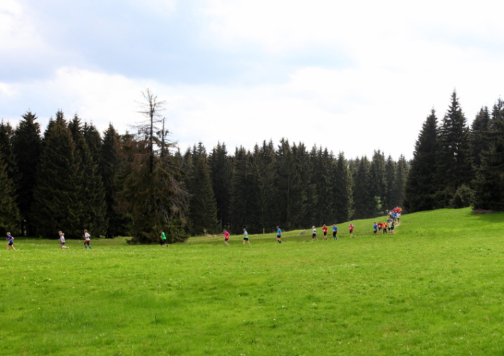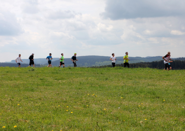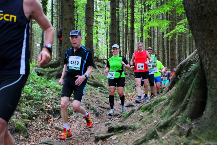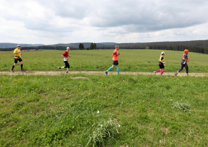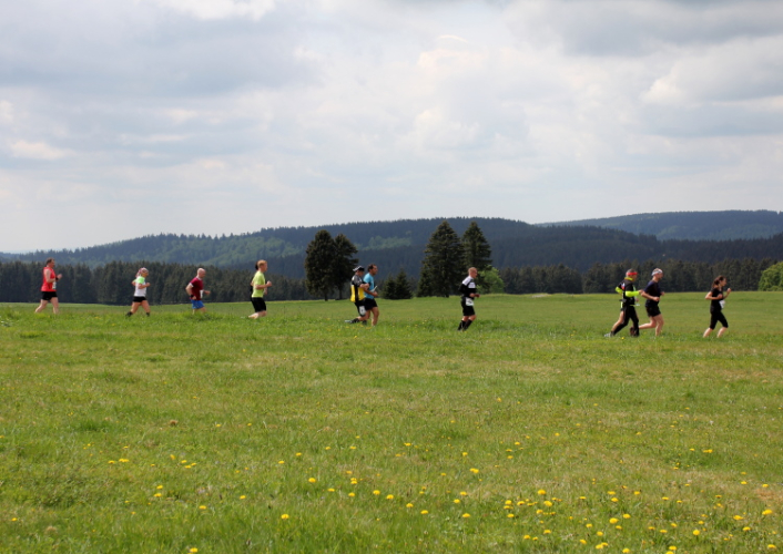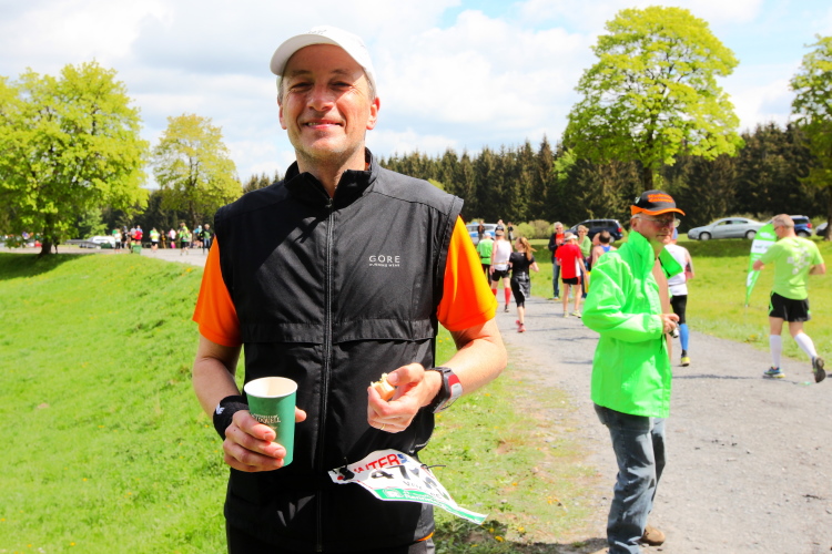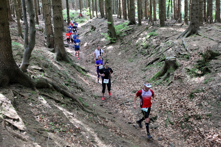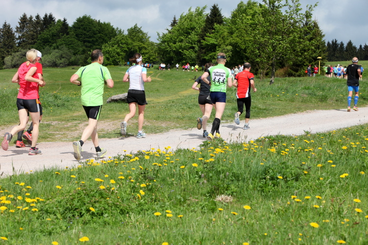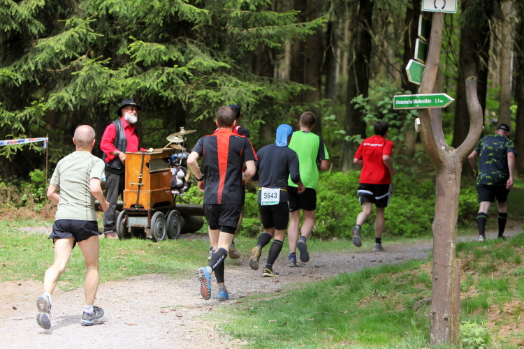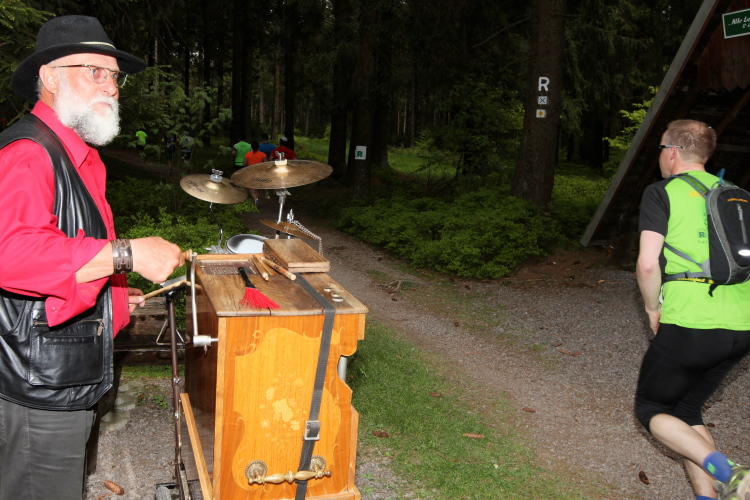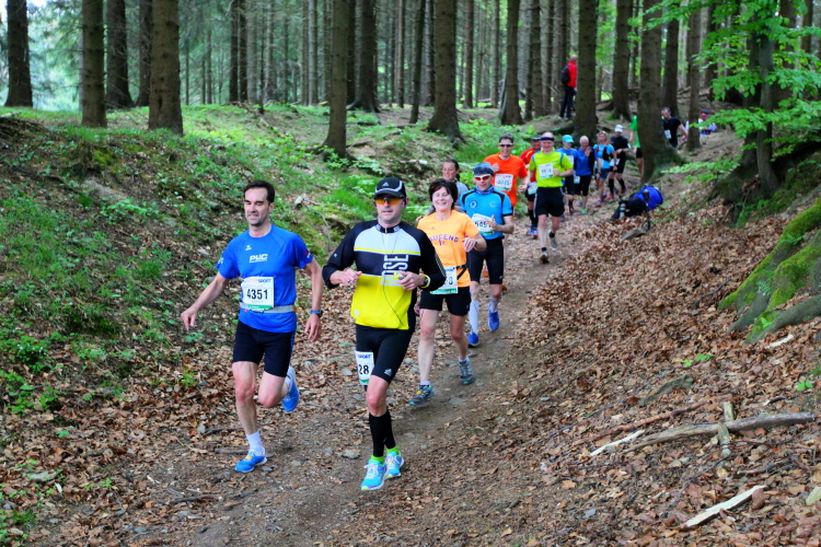 Vor einem kleinen Steg gibt es Stau. Auch in dem folgenden steinigen Hohlweg, an dem jeder Trailer seine Freude hat, geht es nur langsam vorwärts. Macht nichts, es ist eh Vorsicht angesagt. Am Ende erreichen wir die nächste Verpflegungsstation bei Kilometer 22,2 an der Schwalbenhauptwiese. Auch hier greife ich wieder zum Tee.