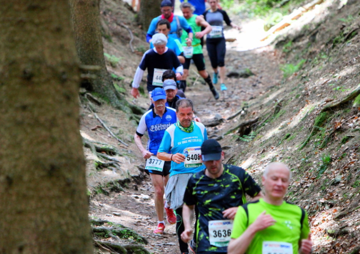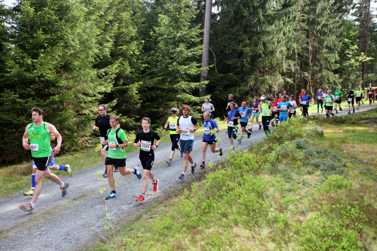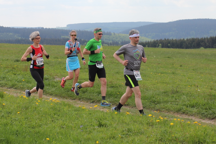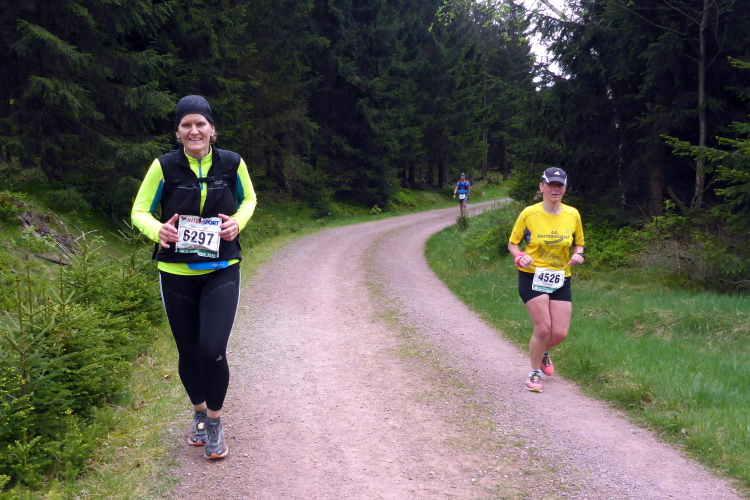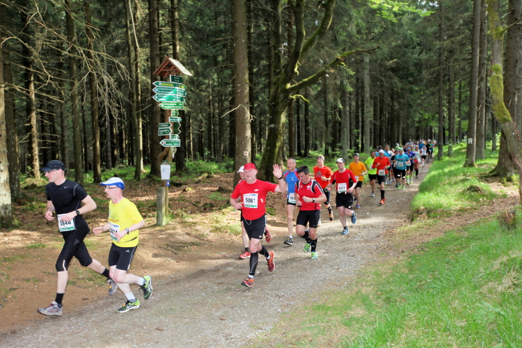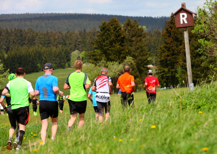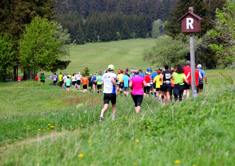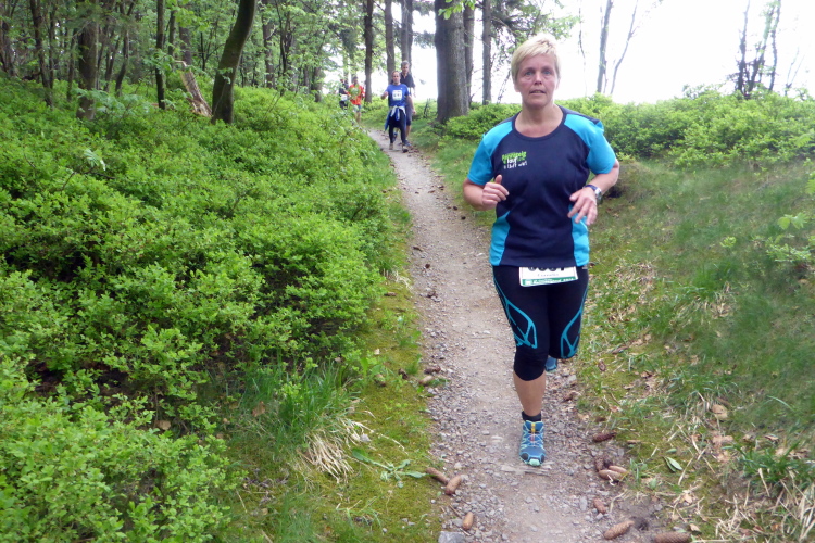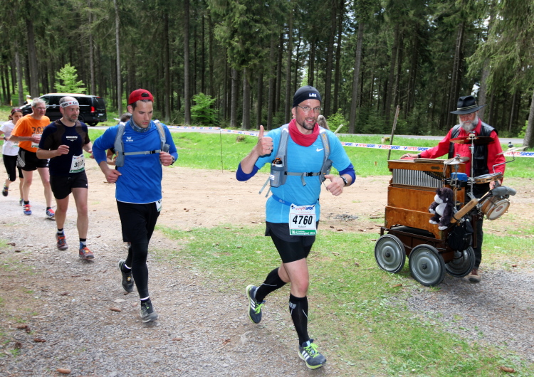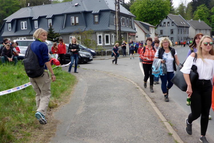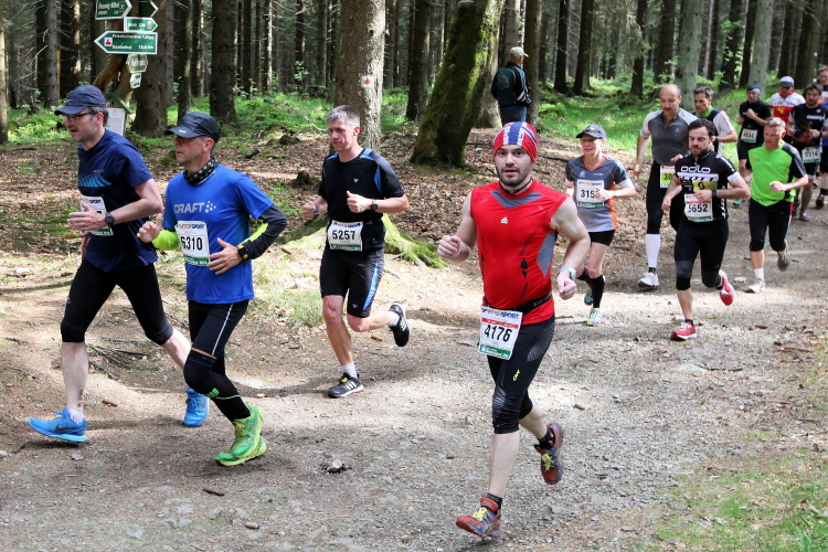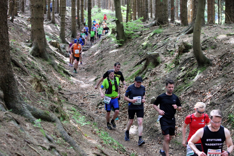 Vor einem kleinen Steg gibt es Stau. Auch in dem folgenden steinigen Hohlweg, an dem jeder Trailer seine Freude hat, geht es nur langsam vorwärts. Macht nichts, es ist eh Vorsicht angesagt. Am Ende erreichen wir die nächste Verpflegungsstation bei Kilometer 22,2 an der Schwalbenhauptwiese. Auch hier greife ich wieder zum Tee.