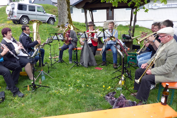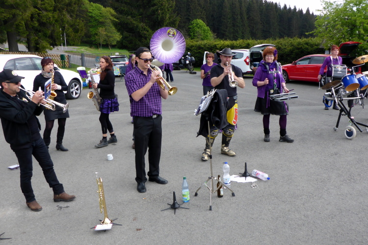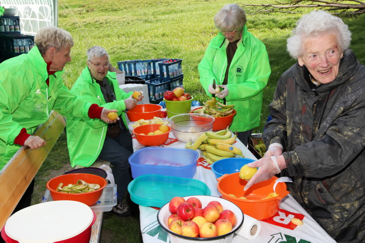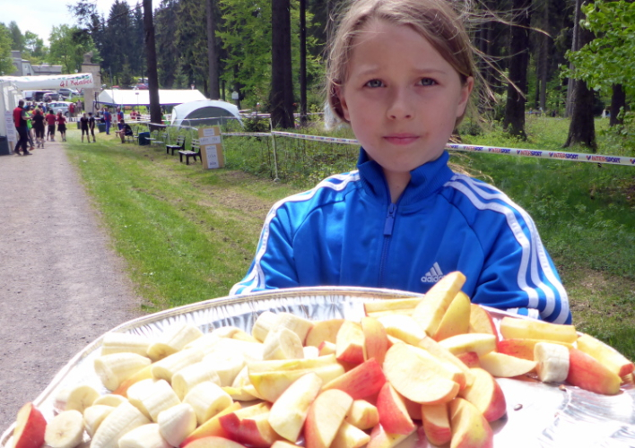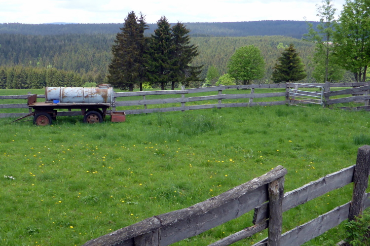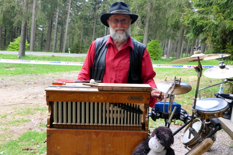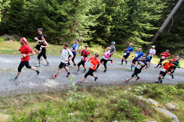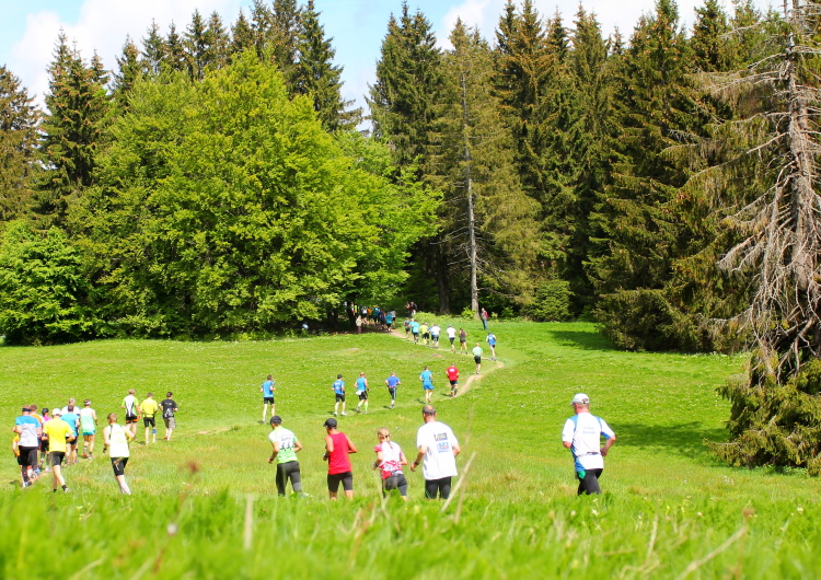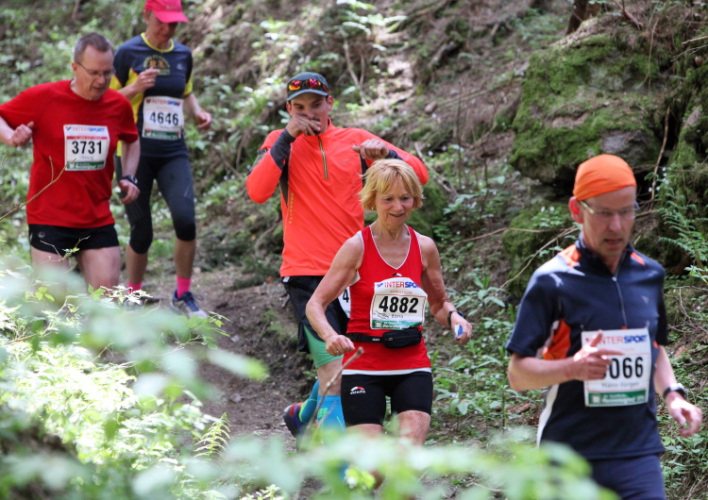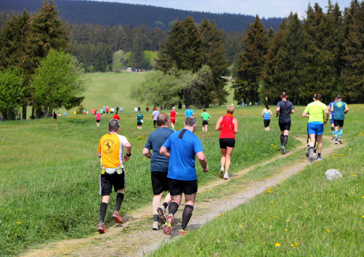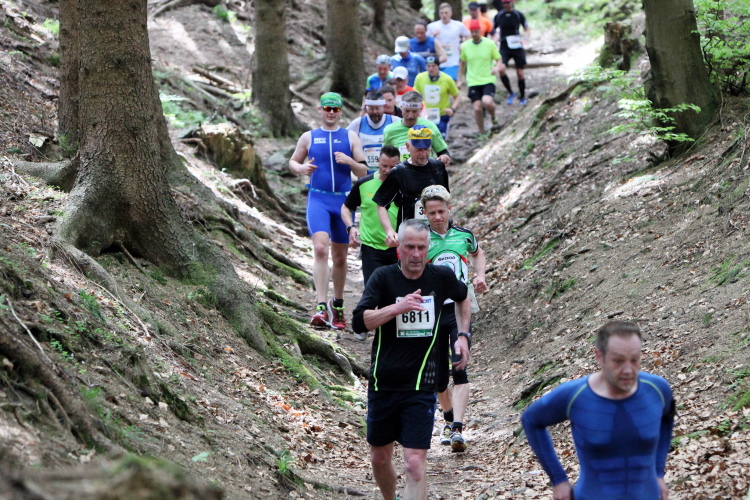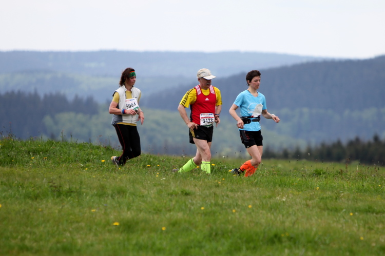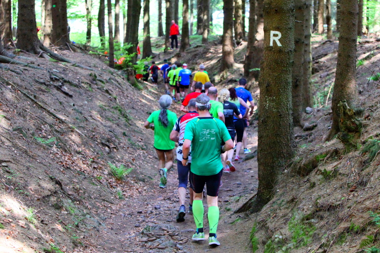 Vor einem kleinen Steg gibt es Stau. Auch in dem folgenden steinigen Hohlweg, an dem jeder Trailer seine Freude hat, geht es nur langsam vorwärts. Macht nichts, es ist eh Vorsicht angesagt. Am Ende erreichen wir die nächste Verpflegungsstation bei Kilometer 22,2 an der Schwalbenhauptwiese. Auch hier greife ich wieder zum Tee.